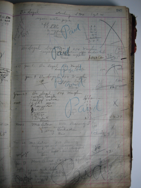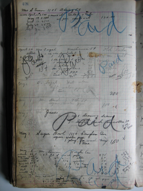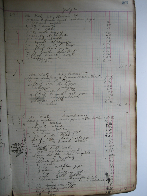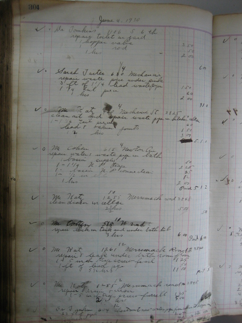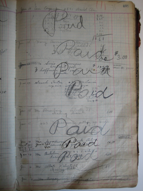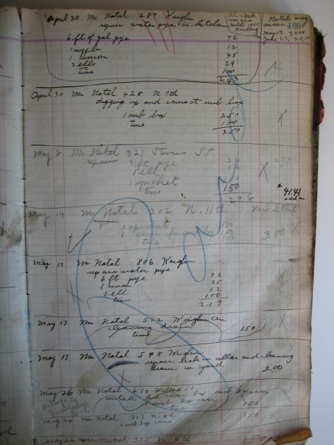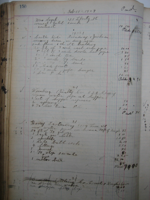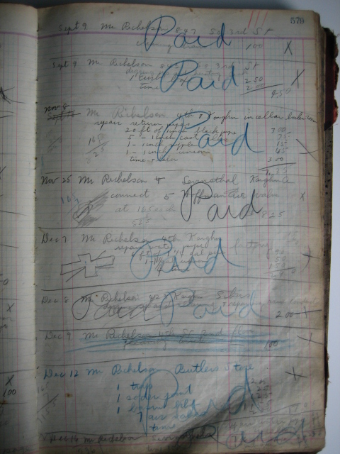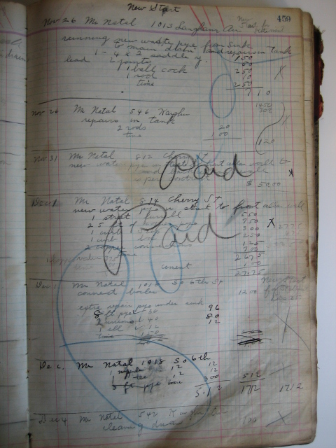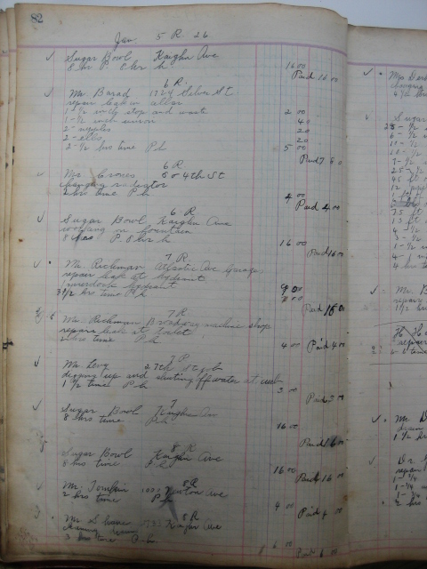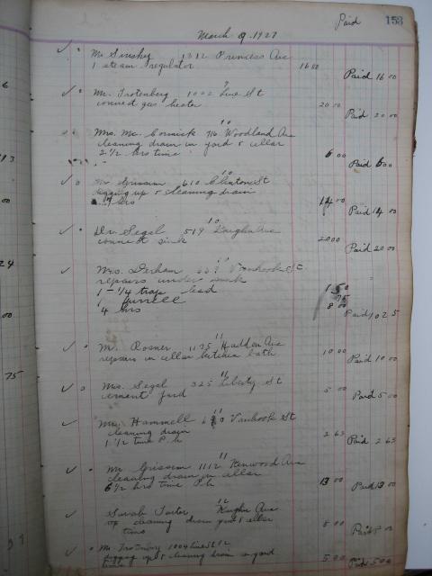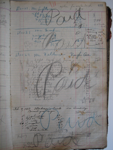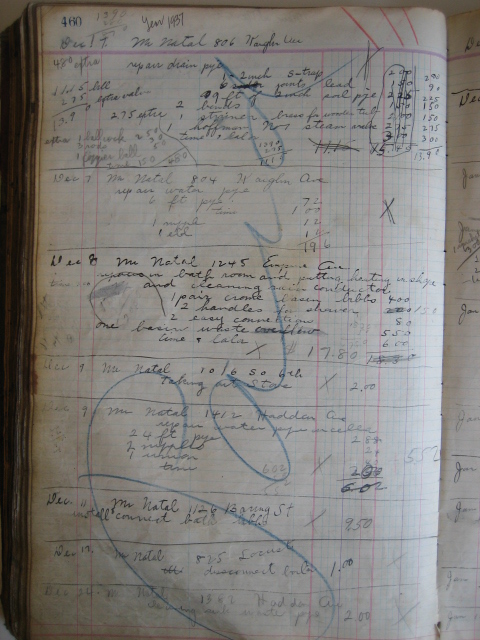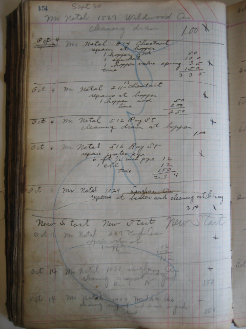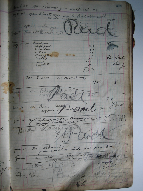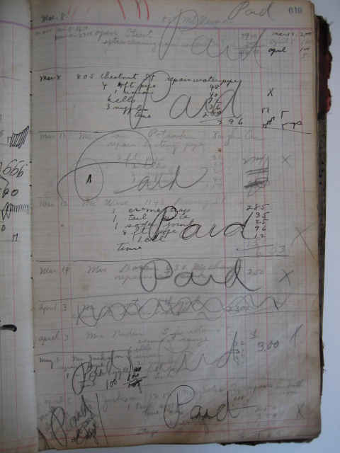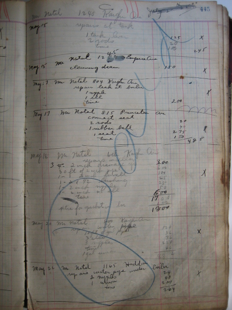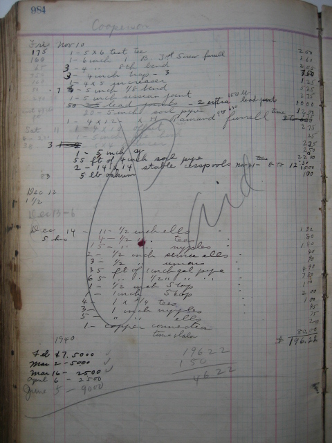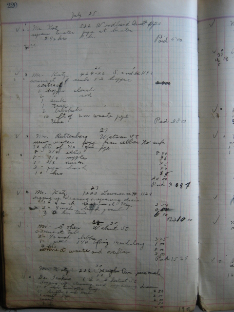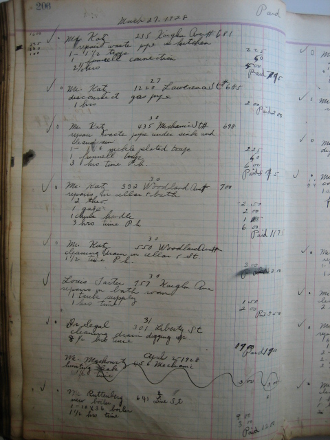 Ross Plumbing was the business of the Ross family, and bore the name of its founder, Isreal Ross, who went into business as a plumbing and heating contractor in 1918. He had previously partnered with Francis Bicker Jr., son of Dr. Francis Bicker, a well known physician in Camden's Eighth Ward. He may still have been in business with Bicker into the 1920s. By January of 1920 Isreal Ross and his wife, the former Annie Silverman, had bought a house at 1145 Baring Street. Annie Silverman was the daughter of Becky Silverman, who owned an operated a clothing business at 299 Kaighn Avenue, the corner of South 3rd Street and Kaighn Avenue. A set of journals that begin in 1924 seem to indicate that the partnership with Francis Bicker Jr. had dissolved, and that Isreal Ross had started his own business. These journals, presented here, show every job that Isreal Ross undertook, indicate that he worked for many people who were or would become well known in Camden. He also had begun doing work for various real estate operators. Sometime after the fall of 1936 Israel Ross acquired the building at 1142 South 6th Street, where the Tarter family had once conducted a bottling business. Isreal Ross lived and operated his business here, the Ross Plumbing & Heating Company, through at least 1947. By that time sons Edward and Leonard had joined the business. Ross Plumbing and Heating did a great portion of its business with Camden real estate operators and landlords. Some of the larger and more notable clients in the 1930s and 1940s included Benjamin Natal, Theodore Tiedeken, Samuel Gelfand, Louis Richelson, Louis Dorflinger, Ellis Goodman, Zellie Ellis, Joseph and William Lipkin, and Alex Malamut. There was also institutional work, for the Talmud Torah building, churches and synagogues, and Belleview Hospital. They also did work for several Camden physicians, including Dr. Ulysses Wiggins, Dr. William Lashman, and Dr. Marcus Wheatland. Commercial accounts included Trilling & Montague, a company involved with many of the bar businesses in Camden, Quality Drugs, and several businesses on Broadway, Kaighn Avenue, and throughout the city. They also worked for several Building and Loan Associations and the Federal Deposit Insurance Corporation's real estate operation. Isreal Ross passed away on April 12, 1962. He was buried the following day at Crescent Burial Park in Pennsauken NJ. He was survived by his wife and sons, who carried the business forward. Anna Silverman Ross passed away in Cherry Hill NJ in 1993. The Ross Plumbing and Heating Company was still operating on South 6th Street as late as the fall of 1977, and owned the property into the late 1990s. For more about the the family and business of Isreal and Anna Ross, please visit the following web-pages on on this site: