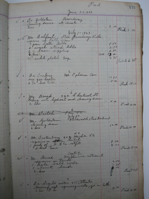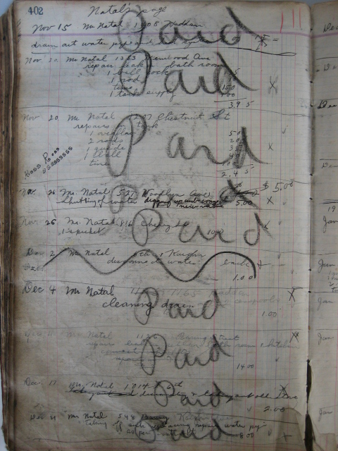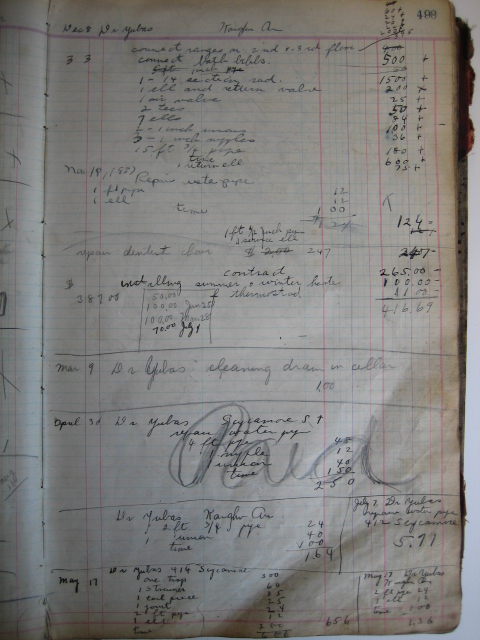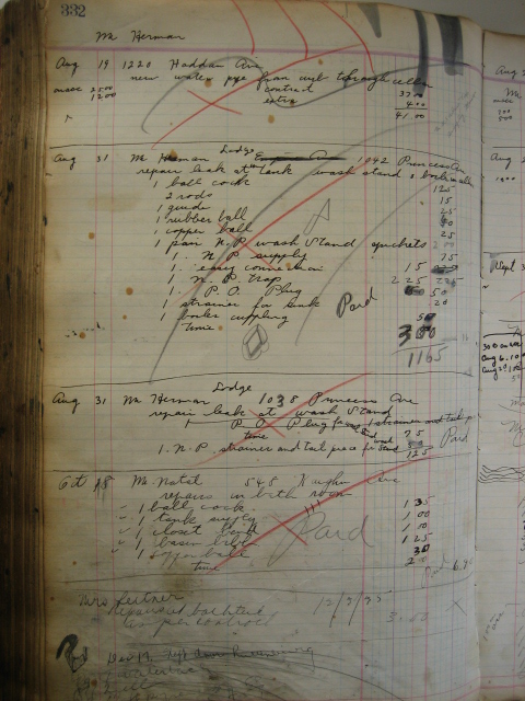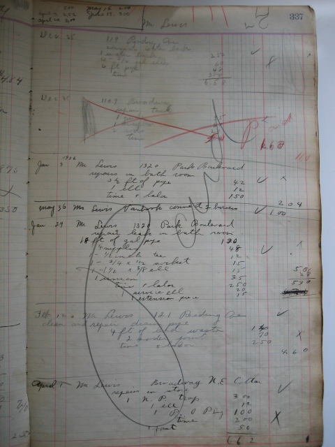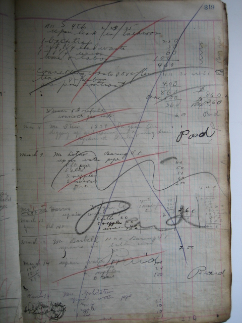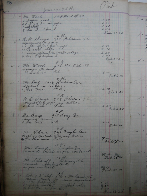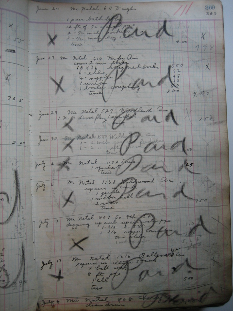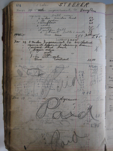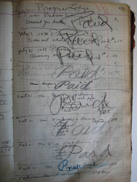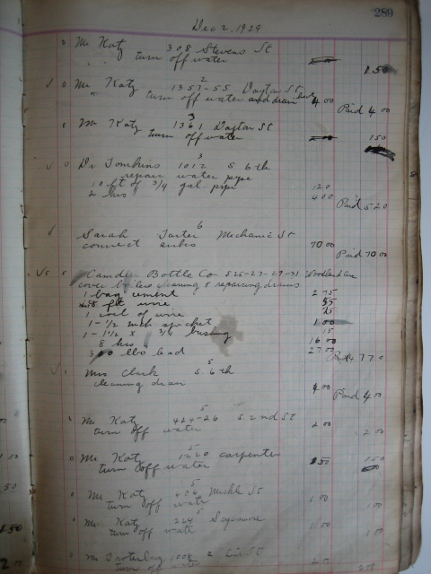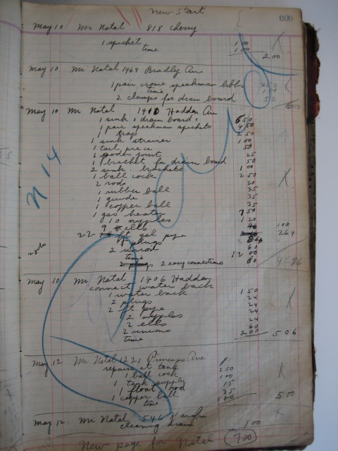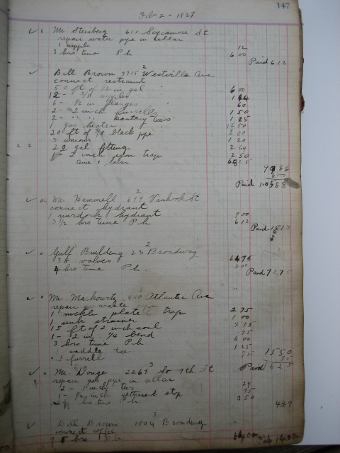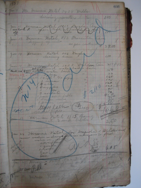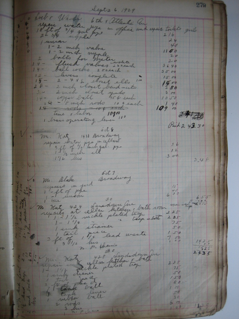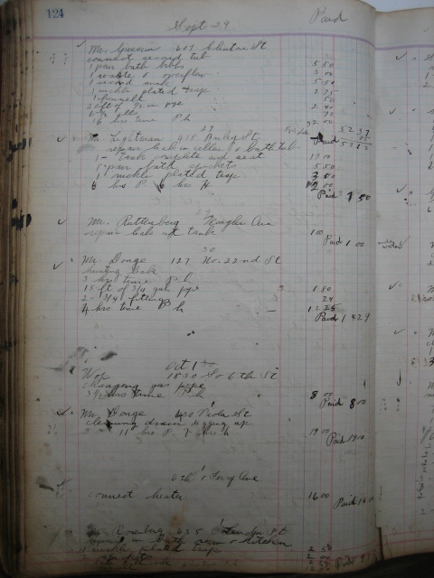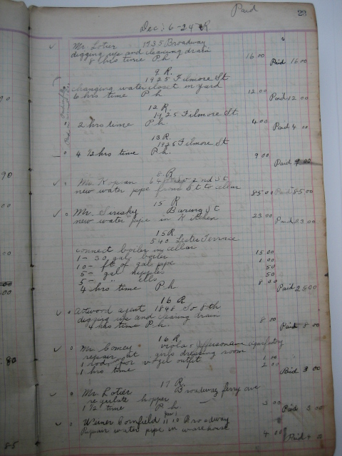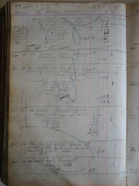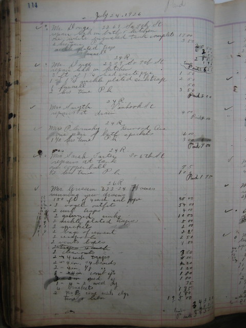 Ross Plumbing was the business of the Ross family, and bore the name of its founder, Isreal Ross, who went into business as a plumbing and heating contractor in 1918. He had previously partnered with Francis Bicker Jr., son of Dr. Francis Bicker, a well known physician in Camden's Eighth Ward. He may still have been in business with Bicker into the 1920s. By January of 1920 Isreal Ross and his wife, the former Annie Silverman, had bought a house at 1145 Baring Street. Annie Silverman was the daughter of Becky Silverman, who owned an operated a clothing business at 299 Kaighn Avenue, the corner of South 3rd Street and Kaighn Avenue. A set of journals that begin in 1924 seem to indicate that the partnership with Francis Bicker Jr. had dissolved, and that Isreal Ross had started his own business. These journals, presented here, show every job that Isreal Ross undertook, indicate that he worked for many people who were or would become well known in Camden. He also had begun doing work for various real estate operators. Sometime after the fall of 1936 Israel Ross acquired the building at 1142 South 6th Street, where the Tarter family had once conducted a bottling business. Isreal Ross lived and operated his business here, the Ross Plumbing & Heating Company, through at least 1947. By that time sons Edward and Leonard had joined the business. Ross Plumbing and Heating did a great portion of its business with Camden real estate operators and landlords. Some of the larger and more notable clients in the 1930s and 1940s included Benjamin Natal, Theodore Tiedeken, Samuel Gelfand, Louis Richelson, Louis Dorflinger, Ellis Goodman, Zellie Ellis, Joseph and William Lipkin, and Alex Malamut. There was also institutional work, for the Talmud Torah building, churches and synagogues, and Belleview Hospital. They also did work for several Camden physicians, including Dr. Ulysses Wiggins, Dr. William Lashman, and Dr. Marcus Wheatland. Commercial accounts included Trilling & Montague, a company involved with many of the bar businesses in Camden, Quality Drugs, and several businesses on Broadway, Kaighn Avenue, and throughout the city. They also worked for several Building and Loan Associations and the Federal Deposit Insurance Corporation's real estate operation. Isreal Ross passed away on April 12, 1962. He was buried the following day at Crescent Burial Park in Pennsauken NJ. He was survived by his wife and sons, who carried the business forward. Anna Silverman Ross passed away in Cherry Hill NJ in 1993. The Ross Plumbing and Heating Company was still operating on South 6th Street as late as the fall of 1977, and owned the property into the late 1990s. For more about the the family and business of Isreal and Anna Ross, please visit the following web-pages on on this site: