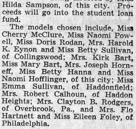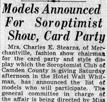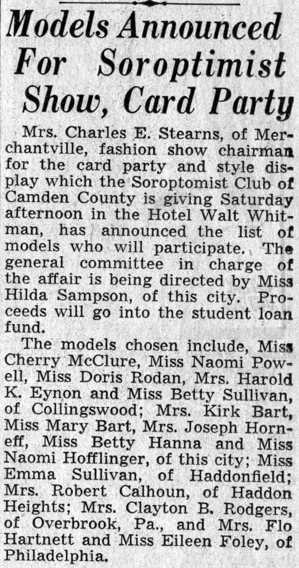 Soroptimists Plan 'Dress Parade' as Benefit Feature A "dress parade" at two o'clock will precede the Camden Soroptimist card party this Saturday at the Hotel Walt Whitman, here. The affair, planned under the direction of Mrs. Hazel B. Hackett. past president, and Miss Marguerite C. Rudder, who now holds that office, is one of the most elaborate benefit ventures of the club this year and proceeds will be added to the convention fund. Miss Jane Anderson, of this city, and Miss Helen Newkirk, of Collingswood, are co-chairmen of the fashion show, which will include a number of the latest knitted suits and coats. Models will be Mrs. M. Himmelein, Mrs. Harry Cramer, Miss Adelaide McGuire, Miss Charlotte Gravatt, Miss Mildred L. Buzby, Mrs. Joseph Bantivoglio and Mrs. Mary Koch, who will display cloth suits, coats, day and evening frocks, and Miss Jean Lamb, Miss Doris Rodan, Miss Olga Borch and Mrs. Harold K. Eynon, who will wear knitted attire. Cards will follow the display. |