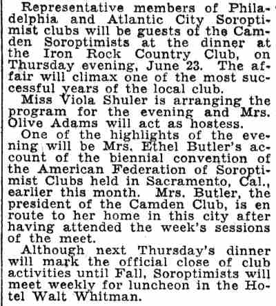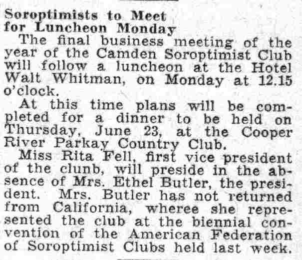 Soroptimists to Meet For Luncheon Monday Camden Soroptimists will hold their June business meeting following luncheon in the Hotel Walt Whitman on Monday. Mrs. Mary A. Koch, president, will preside, at the meeting when projects for next year will be presented. Plans for entertaining Mercy Ellen Crehan of Vancouver the American Federation president, have been abandoned as her stay in the West, where she is visiting Soroptimist clubs, has been prolonged indefinitely. The June social meeting is scheduled for the fourth Monday and will close the season's activities . |