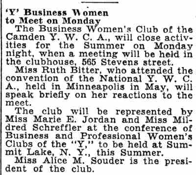 Soroptimists to Hold Informal Weekly Luncheons Although the Camden Soroptimist Club will hold no regular meeting until September, members will gather each Monday for luncheon in the club rooms of the Hotel Walt Whitman. These informal get-togethers were begun last Summer and proved such a success that they are being repeated this season. Mrs. Mary A. Koch is the president, of the club composed of business and professional women of Camden and vicinity. A picnic supper in the basement of Centenary-Tabernacle M. E. Church, this week, for the Girl Scouts of Camden Troop No. 28, was the final social event on the calendar. Mrs. Clara Anthony, a member of the club; who is captain of the troop, arranged the affair. At this time, the annual awards were made to the scouts. Miss Betty Starliper and Miss Isabel McMorrow were presented with gold stars for perfect attendance and Miss Joyce Smith and Miss Sarah Molotsky, silver stars for 90 percent attendance. A medal for good behavior was won by Miss Betty Jones and for neatness, by Miss Marguerite Heritage. Honorable mention for neatness was given Miss Virginia Hahn and Miss Ruth Elaine Sharp. |
