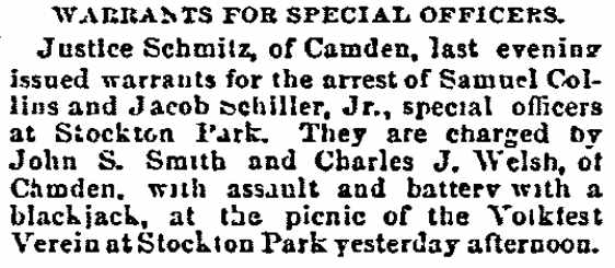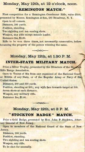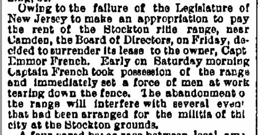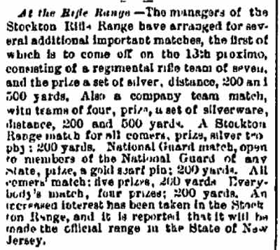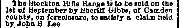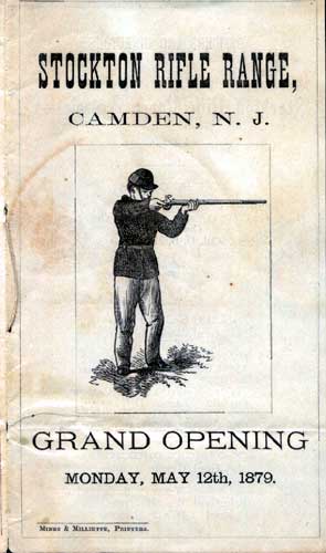 More or less the equivalent of the modern golf course and country club, The Stockton Rifle Range Association was organized by Samuel H. French and a group of Civil War veteran officers including General William Joyce Sewell in1866. When first established it was laid out on 43 and one half acres in the Wrightsville section of old Stockton Township, more or less in the vicinity of the present-day John F. Kennedy Towers senior citizen apartment building at South 20th Street and Watson Street in East Camden. In 1885 George Reeder Prowell wrote in his History of Camden County, New Jersey the following: The range proper is provided with the best improved batteries and firing grounds in the United States. as originally built, it contained ranges up to one thousand yards; but as this was seldom used, it was deemed advisable to reduce it to six hundred yards. The New Jersey and Pennsylvania Rifle Clubs and teams, the Pennsylvania National Guards, and other national military companies meet at this place, and the range is provided with magazines and closets for the exclusive use of the different State organizations. Soon after the rifle range was started an additional forty six and one-half acres of ground was laid out in connection with the grounds of the range, as a park and pleasure resort, making the park ninety acres in extent. The park was known as Stockton Park, and in time the entire ninety acre complex was known by that name. It fell into disuse after Stockton Township merged with the City of Camden. Old Stockton Park's last recreational use was by Camden naturalist Warren E. Buck. Raised at 1902 Stockton Park, he operated a zoo on the grounds during the late 1920s and on into the 1930s before relocating his operation to a site along Marlton Pike (State Highway 70), east of the rail line that cross that thoroughfare, in what was then Delaware Township (present day Cherry Hill) NJ. The site was also used during the depression by local gardeners o grow vegetables, and most likely also was used for that purpose during World War II. |