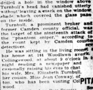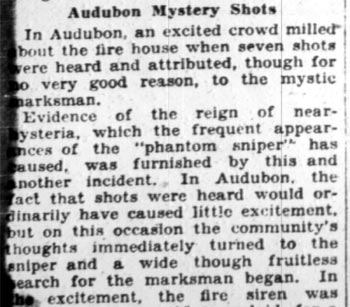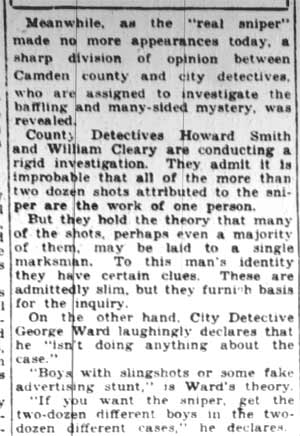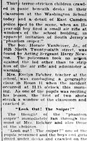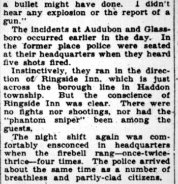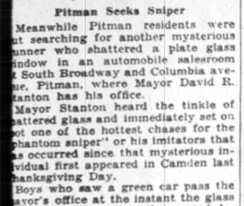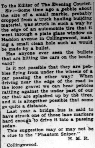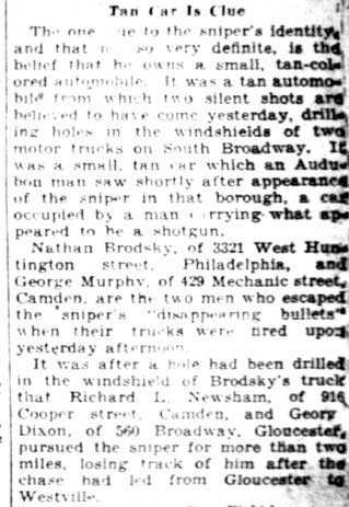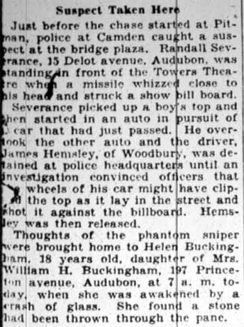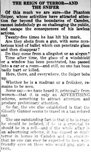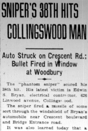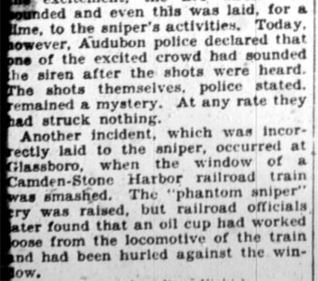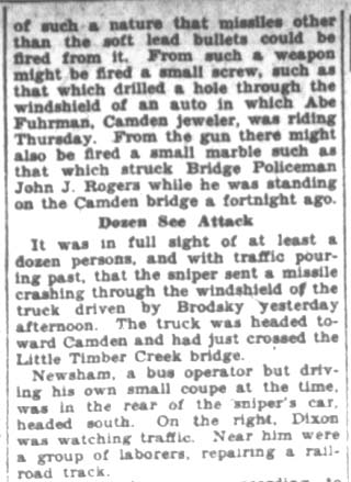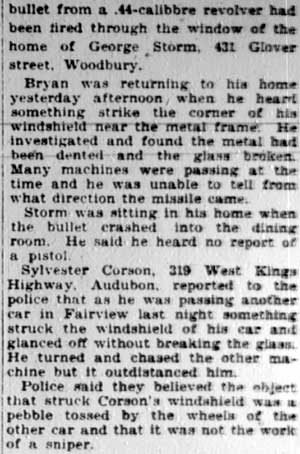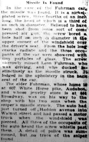 Since the Woodruff incident, a Riverton family has been fired upon, another automobile windshield has been penetrated, apparently by a bullet while crossing Federal Street bridge and on Sunday night, Mrs. A. D. Kohn, 319 Evans Street, Haddonfield, was cut by flying glass when her car was made the target of the sniper.
