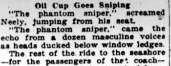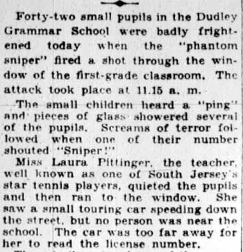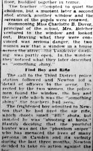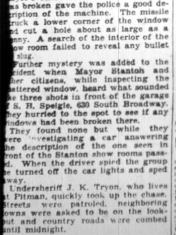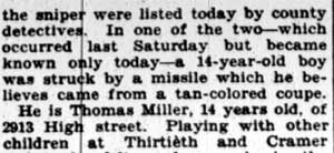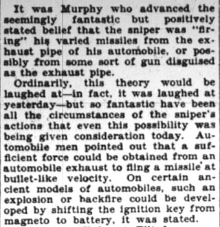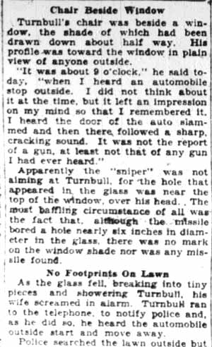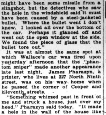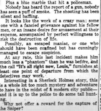 " I am satisfied this is no joke or prank of small boys.” Police Chief Lietenberger said after some of his men examined the course of the bullet. “There was terrific force behind that shot, and the only way to effect the capture of this person is to shoot him on sight if he is observed in the act”.