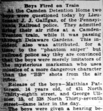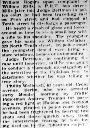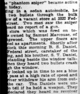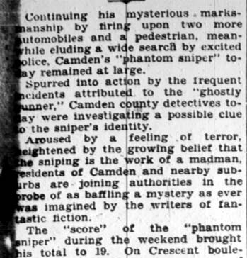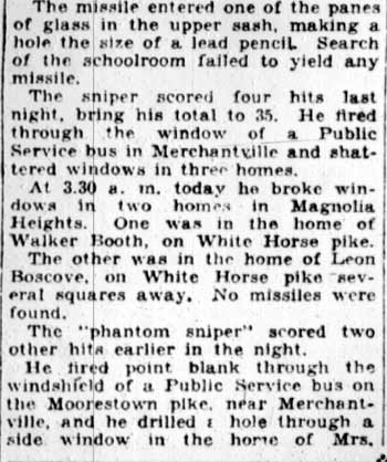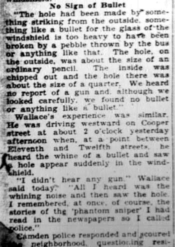 Meanwhile it was revealed that still another incident in which the “phantom sniper” had appeared had taken place last night when a Philadelphia-Pennsauken bus was fired upon near the Federal Street Bridge.
