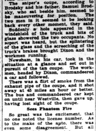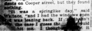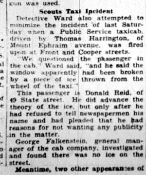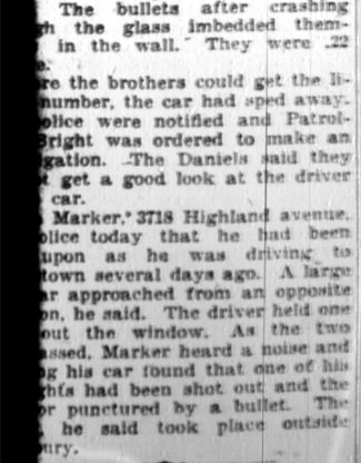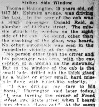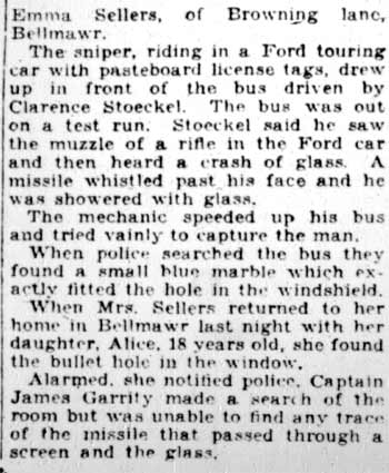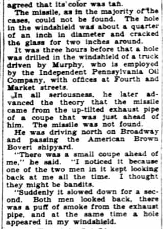 “There were two men in the bus at the time the bullet went through the glass. These men refused to give their names to the driver of the bus. Bridge police were on the job but I believe that it they had searched these two men they would have found a .25 revolver on one of them”.