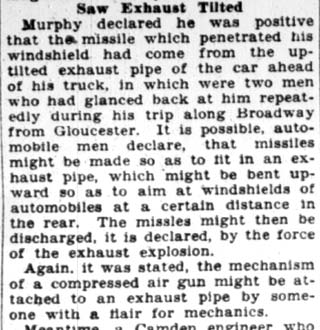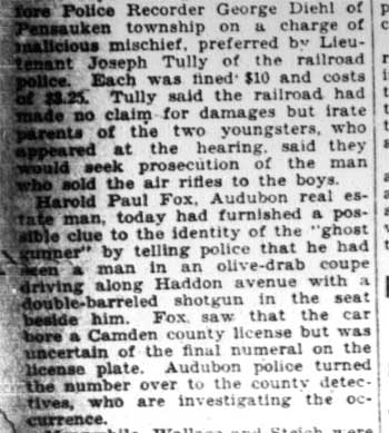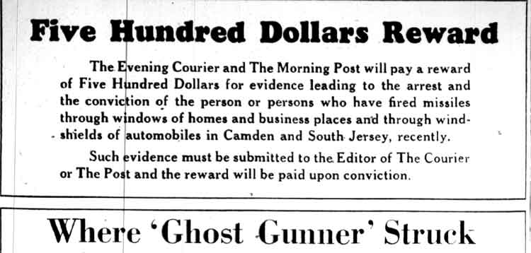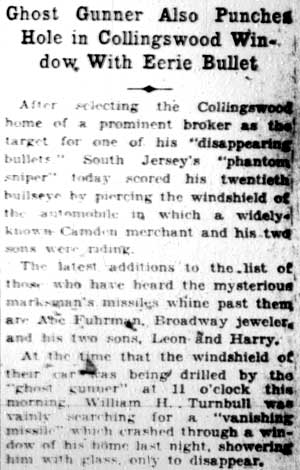 At the Haddon heights police station is a piece of glass with the notation that it comes from the windshield of “Harry F. Cheeseman of Magnolia.” That was the name given by the man who drove up to the police station yesterday afternoon and gasped out a story of having been fired upon by the “ghostly gunner” who, on 15 previous occasions in the past three months has made targets of automobiles and windows.