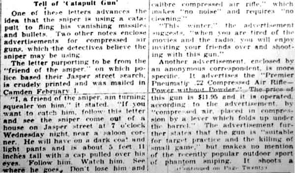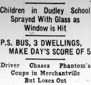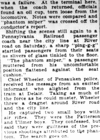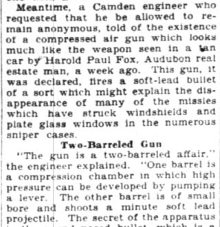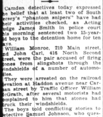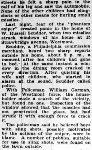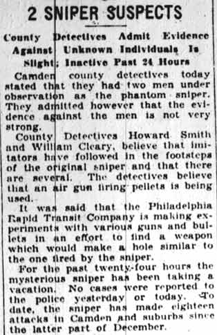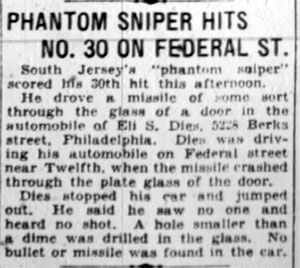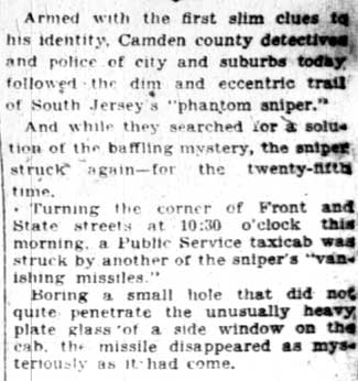 Camden’s “phantom sniper” has made his appearance in Cramer Hill. Using the same mysterious method as that employed by the unknown gunner who has shot holes in the windshields of five automobiles and a motorbus in the last few weeks, someone yesterday fired a missile through the plate glass door at a store conducted by Gottlob Mayer, 868 North North Twenty-seventh Street . It was the eighth time since early December that an incident of the same sport had become known and came close on the heels of a baffled investigation by Camden bridge police, one of whom was struck and knocked down by a blue marble apparently fired from a powerful compressed air gun. Shooting the hole through Mayer’s door also closely followed in time and circumstances, the penetration of the windshield of a Philadelphia-Pennsauken bus by a bullet or other missile. Although Bridge Policeman John J. Rogers found the blue marble which struck him early yesterday morning, investigators declare that the missile which bore a clean round hole through the heavy glass of the bus and store window must have been a bullet. The possibility that the compressed air gun which is believed to have been used in firing the marble at Rogers, might have been used to fire a steel ball bearing at the bus was one theory advanced yesterday. If this were the case, it was agreed by investigators, the air gun must be one more powerful than any known to police. No Bullet Found In Store Mystery in the latest incident that hit Mayer’s store is heightened by the fact that no bullet or other missil e was found inside the store, although it was apparent that the shot or whatever it was entered from the outside. Similarly, an inspection of the motorbus which was fired upon on the Camden Bridge Tuesday disclosed no missile. In these two cases at least, authorities investigating the incidents have been faced with the additional problem of attempting to discover the nature of a missile which to all intents and purposes, disappears as though into thin air after striking. In none of the cases has any report as of a gun been heard. Mayer did not report the incident to police and, although it occurred at 10 o’clock yesterday morning, it did not become known until today. Mayer explained that he had insurance on his plate glass, that he had no enemies and thus did not believe he was the intended target of the mysterious marksman, and that he had thought little of the incident until he read of the activities of the “phantom sniper” on the Camden Bridge. The Mayer store is at the corner of Hayes Avenue and North Twenty-seventh Street, directly across from a Camden Fire Department station. Candy, newspapers, magazines and tobacco are dispensed at the shop, which also contains an ice cream parlor. Heard Crash In Store “I had been out in the store, waiting on six or seven children”, Mayer said today. “It wasn’t two minutes after the children left that this shot was fired. If it had come two minutes before it would have hit one of them because they were standing right near the door. “When the shot- or whatever it was- was fired I was in the kitchen. I heard a crash and came out into the store. Nobody was in sight. I looked at the windows and then I found the little hole, like a bullet hole, through the glass of the door.” The firemen at the firehouse across the street had seen or heard nothing. Neither had several persons who were passing and others in buildings nearby. A search of the interior of the store followed. Every inch of wall and floor space was gone over but there was no sign of a bullet or any other missile. Bridge police, still investigating the activities of the sniper on the span, had no results of their inquiry to make public today. They admitted that more than 24 spent in investigation had brought them no nearer to a solution of the weird mystery than when they began.