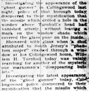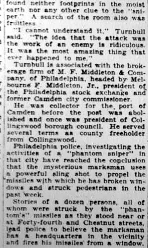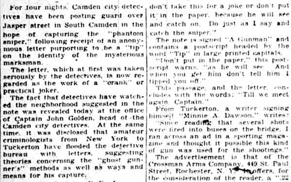 Probing a mystery that sounds more like fantastic fiction than serious fact, police of Camden and officials of the Camden Bridge today were conducting a vigorous hunt for a “phantom sniper.”