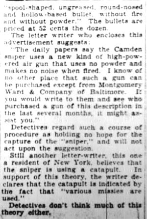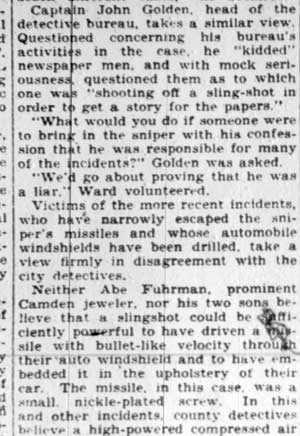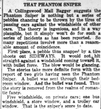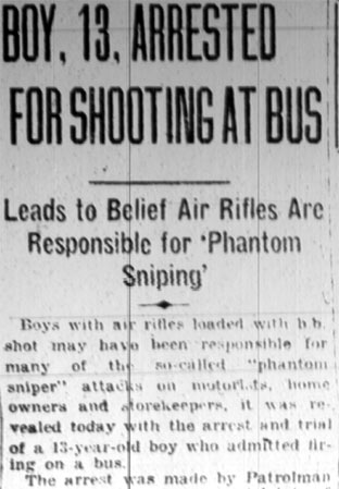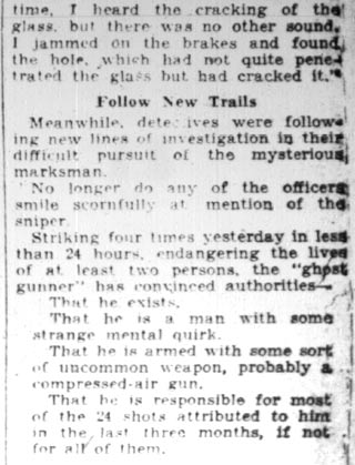 Speculation and theorizing over the peculiar incidents ran riot among the police who are investigating them today. Although the slingshot or air gun theory was given considerable credence by Rogers’ extraordinary experience, other officers insisted that no instrument of this nature would discharge a bullet, ball bearing or other metal missile with sufficient force to bore through the windshields of buses and automobiles which have been fired on by the “phantom sniper.”