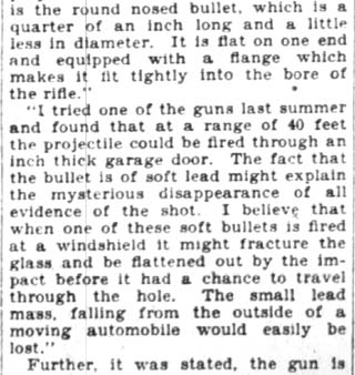 On that occasion, however, the report of a gun was heard by Woodruff, whereas, in subsequent incidents, none of the near victims of the shots have heard any sound. This also strengthens the theory of the existence of air gun or other instrument more powerful than any known to police. If the missiles which have struck other automobiles were bullets, however, it is pointed out that they may have been fired from a rifle or revolver equipped with a silencer.