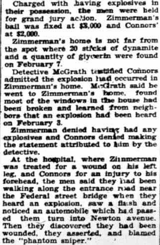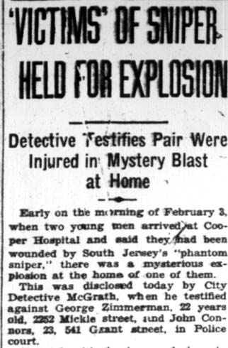 George Zimmerman, of 2270 Mickle Street, burned as though by an explosion, is still in the Cooper Hospital under police guard, and officers also are holding John Connors, of Fifth and Grant Streets, who was similarly injured. Although the man declared they had been fired upon by the ”sniper”, detectives frankly refused to accept this story from the beginning. Hinting that they believed the men had been injured in some sort of explosion, details of which they did not wish to become known, the detectives sought to ascertain whether any safe blowing or hijacking “jobs” had been attempted in this vicinity early yesterday.