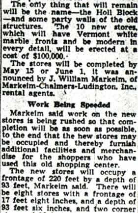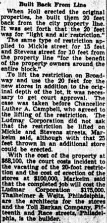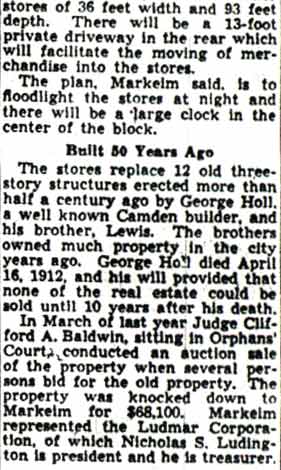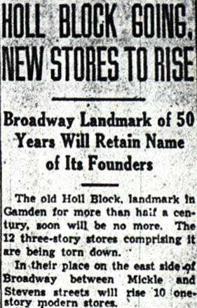 George and Lewis F. Holl built many houses and commercial buildings in Camden in the late 19th and early 20th centuries. The 1887-1888 directory for Camden shows George Holl at the corner of Broadway and Benson Street, and the directory for 1888-1889 has him at 310 broadway. Lewis Holl lived with his wife Emma L. Holl at 328 Mount Vernon Street, Emma Holl also worked as a teacher. During this time the Holl brothers erected 12 three story business properties on the east side of Broadway between mickle and Stevens Streets. George Holl passed away on April 16, 1912, and Lewis on December 18, 1919. The brothers were buried in adjoining plots at Evergreen Cemetery in Camden. The properties on Broadway remained in the family for a time, but eventually found their way into Orphans Court, and were sold at auction in 1941. In 1942 the Holl block was demolished, and 10 one story stores were built which remain in use as of April of 2003. |