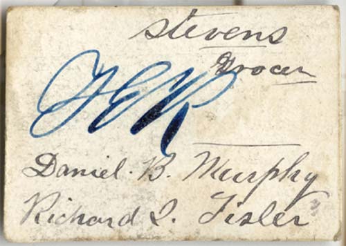 Daniel B. Murphy and Richard Fisler were in their early 20s when the time capsule was placed. Fisler was the son of Dr. Lorenzo Fisler, who served as Camden's Mayor on three separate occasions. His brother, Weston Fisler, played professional baseball and is famous as the man who scored the first run in the history of the National League. Both men remained in Camden and each had businesses of their own in the 1880s and 1890s. It is unclear who "Stevens Grocer" was, or whose initials are in blue. |