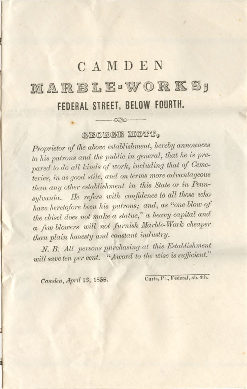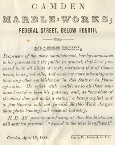 George Mott was biorn in New York around 1825, He was living in Camden by 1850, and was still in the city when the census was taken in 1860. He does not appear in the 1870 Census.