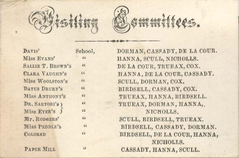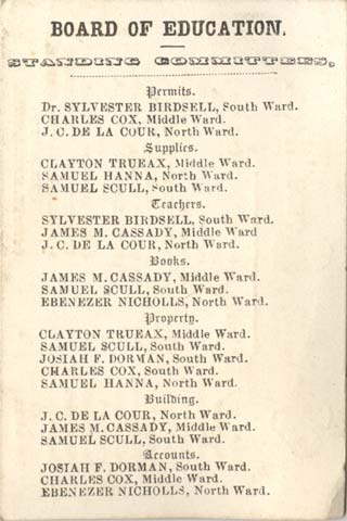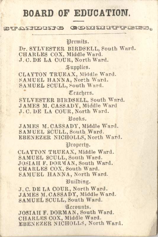 Clayton Trueax, whose name often appears as Clayton Truax, served on the Board of Directors of the Association three different times. He served from 1951 through 1854, 1855 through 1861, and from 1862 to 1877. Clayton Truax was elected to city council in 1855, and remained in elected office for nine years. He was elected mayor on the American Party ticket in 1858, succeeding Benjamin A. Hammell. Clayton Truax was re-elected in 1859 as Mayor. He returned to City Council, and was followed in office by Thomas B. Atkinson.