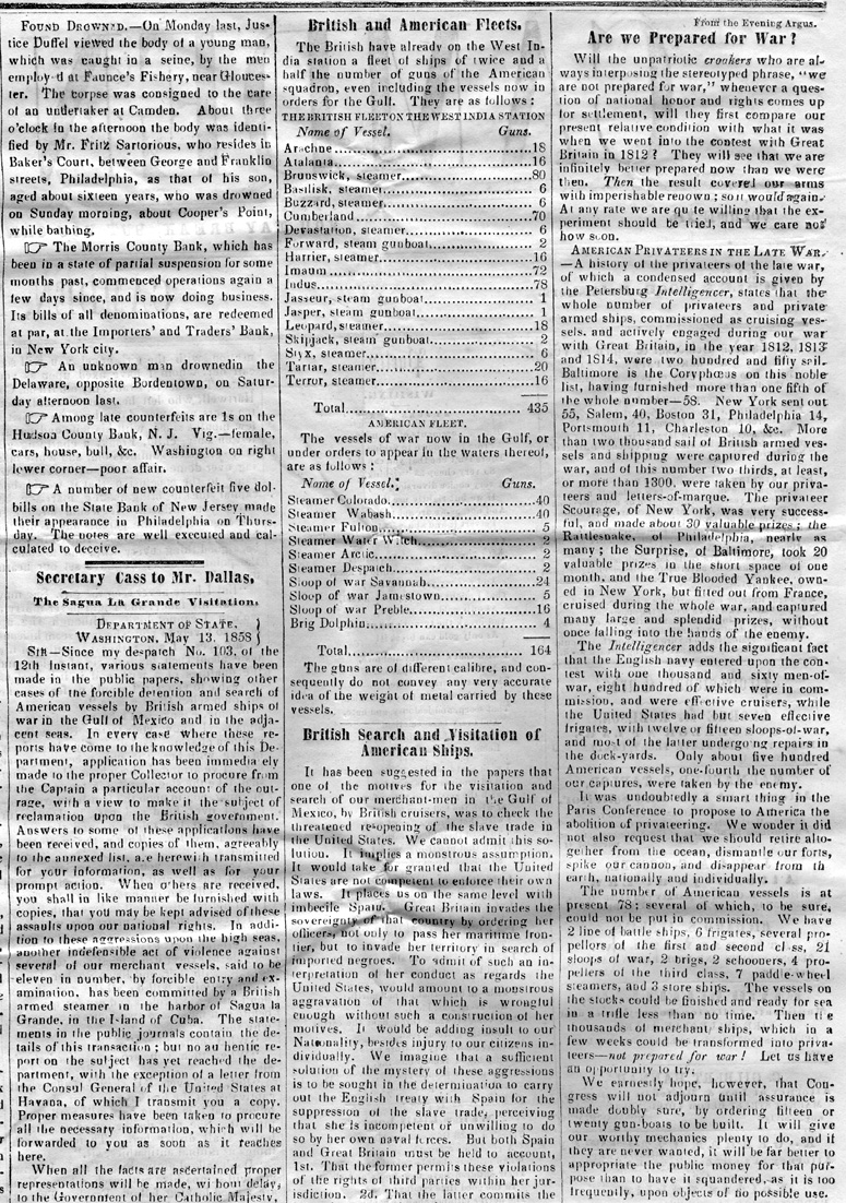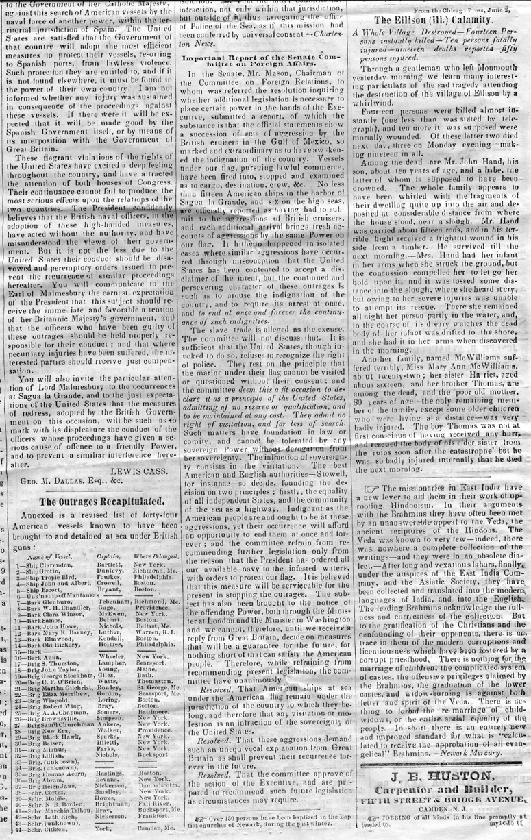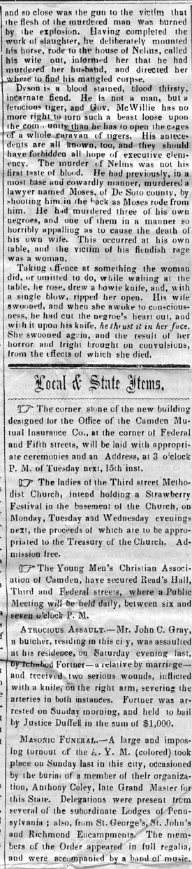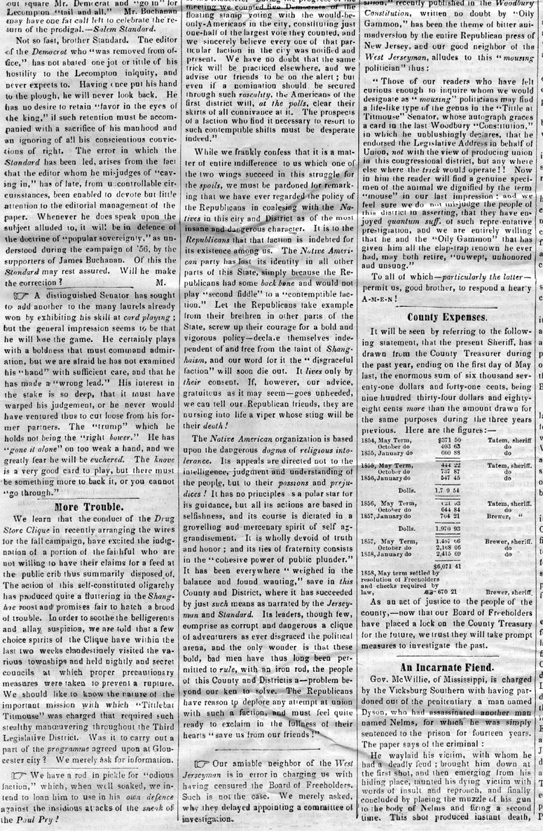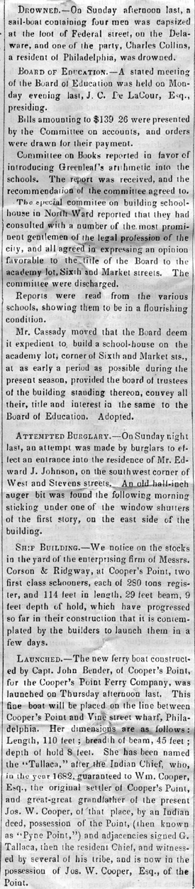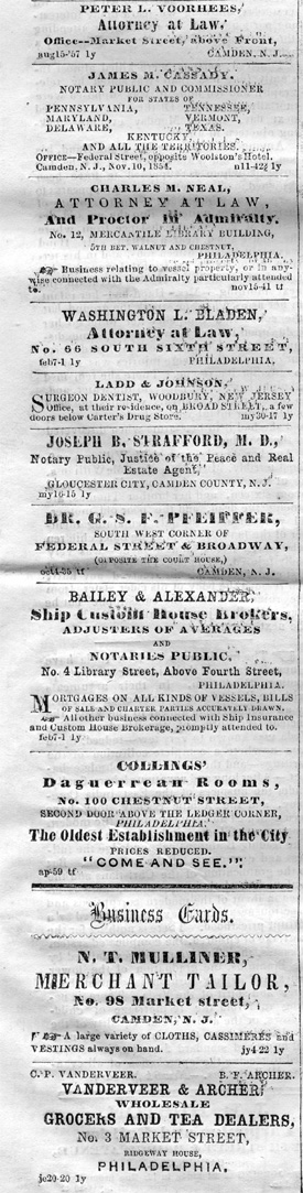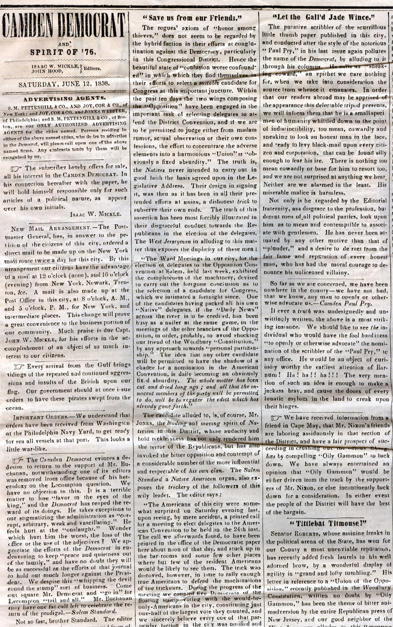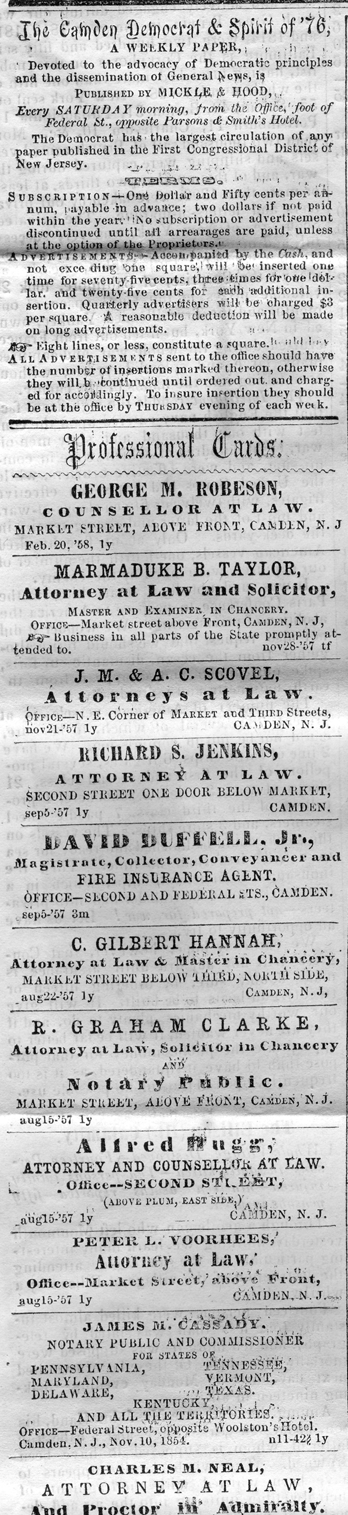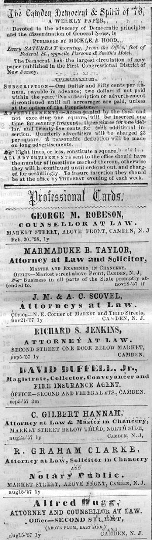 The Camden Democrat was first published in November of 1846 and remained in existence through October of 1908. The June 12, 1858 edition of this newspaper was included in the contents of a time capsule buried in June of 1858. This is how this page came to be: In September of 2005, workmen employed by the FFC Construction Company of Gloucester City NJ were instructed to erect a fence at the south-west corner of Fifth and Federal as a safety precaution for pedestrians, as the recently installed River Line light rail tracks pass by the intersection. The workers were using a large auger to dig a hole for one of the fenceposts to be installed. At one point in the installation, the auger struck a metal box. The box, made of lead and sealed by having its seams welded, was penetrated. The workers looked at the contents, and seeing old newspapers and other artifacts, turned the box over to Mr. James Ferry, the owner of the company. Mr. Ferry, whom I was acquainted with professionally but had only by telephone, mentioned the discovery to a mutual friend, Ed Neumann, who thought that it would be a good idea to copy as much of the printed material as possible for inclusion on this website. Mr. Ferry was in agreement. Due to circumstances beyond everyone's control, It was not until the first week of June 2006 that the contents of the box the were undamaged were turned over to me to be scanned for the Internet. Upon examination, I determined that the time capsule was buried in June of 1858, when the new building of the Camden Mutual Insurance Association was dedicated at the southwest corner of Fifth and Federal Streets. In 1881 the business was renamed the Camden Fire Insurance Association. This building stood for about 40 years, and was replaced by a new building designed by architect Arthur Truscott, brother of then Association vice-president J. Lynn Truscott. The new building, known as the Camden Fire Insurance building, stood for about 100 years before being razed. Among the contents of the time capsule was a copy of the June 12 edition of the Camden Democrat, a four page newspaper. I've reproduced part of page one and all of pages 2, 3, & 4. Please contact me by e-mail with any comments or questions.