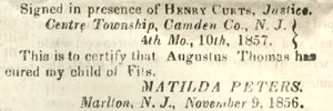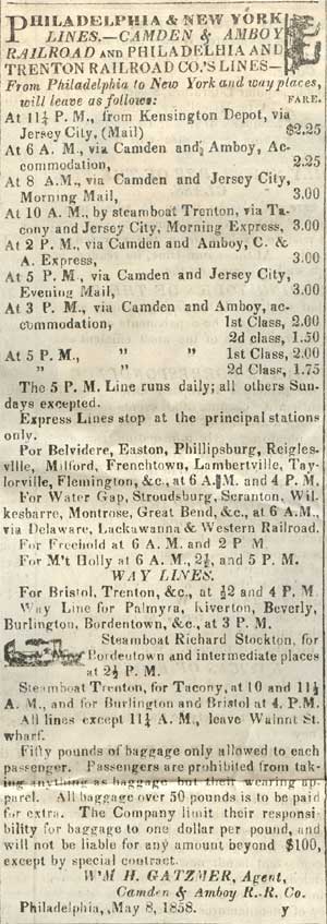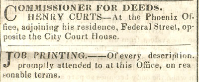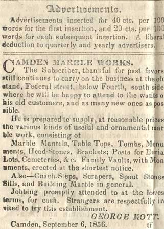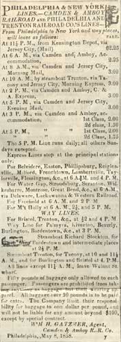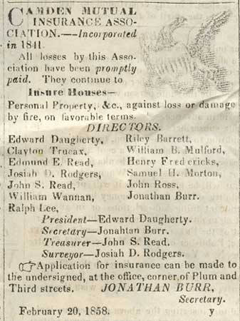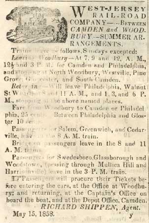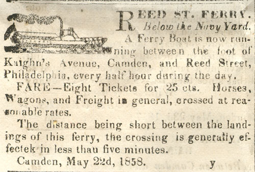 The Camden Weekly Phenix and West Jersey Democrat Journal was published briefly in Camden during the late 1850s. It must not have been to succsseful or long-lived, as no mention of it appears in George Reeser Prowell's History of Camden County, New Jersey which was written in the 1880s. The May 22, 1858 edition of this newspaper was included in the contents of a time capsule buried in June of 1858. This is how this page came to be: In September of 2005, workmen employed by the FFC Construction Company of Gloucester City NJ were instructed to erect a fence at the south-west corner of Fifth and Federal as a safety precaution for pedestrians, as the recently installed River Line light rail tracks pass by the intersection. The workers were using a large auger to dig a hole for one of the fenceposts to be installed. At one point in the installation, the auger struck a metal box. The box, made of lead and sealed by having its seams welded, was penetrated. The workers looked at the contents, and seeing old newspapers and other artifacts, turned the box over to Mr. James Ferry, the owner of the company. Mr. Ferry, whom I was acquainted with professionally but had only by telephone, mentioned the discovery to a mutual friend, Ed Neumann, who thought that it would be a good idea to copy as much of the printed material as possible for inclusion on this website. Mr. Ferry was in agreement. Due to circumstances beyond everyone's control, It was not until the first week of June 2006 that the contents of the box the were undamaged were turned over to me to be scanned for the Internet. Upon examination, I determined that the time capsule was buried in June of 1858, when the new building of the Camden Mutual Insurance Association was dedicated at the southwest corner of Fifth and Federal Streets. In 1881 the business was renamed the Camden Fire Insurance Association. This building stood for about 40 years, and was replaced by a new building designed by architect Arthur Truscott, brother of then Association vice-president J. Lynn Truscott. The new building, known as the Camden Fire Insurance building, stood for about 100 years before being razed. Among the contents of the time capsule was a copy of the May 22, 1858 edition of the Camden Weekly Phenix & West Jersey Democrat Journal, a four page newspaper published by Henry Curts. I've excerpted the articles of local interest. Please contact me by e-mail with any comments or questions.