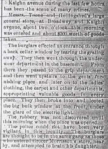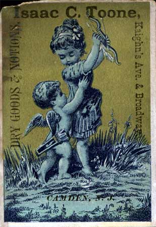 Kaighn Avenue. Isaac C. Toone was friendly with City Engineer Levi Farnham. On June 18, 1903 the Camden Daily Courier reported "William C. Riggs and wife, then City Surveyor Levi Farnham and wife, Daniel Garwood and wife, Isaac C. Toone and wife and George E. Taylor and wife are a party of Camdenites enjoying the grocers' excursion to Eaglesmere, Pa. They will be gone a few days". He was also friendly with Alexander G. Cattell. Isaac C. Toone had passed away in June of 1910. He was survived by his wife Annie, and a son Howard, then living in Collingswood, who was managing the family business. The Toone & Hollinshead Department Store was destroyed in a fire on December 14, 1921. |