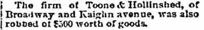 & HOLLINSHED, DRY GOODS & NOTIONS THERE is not an establishment in the city that is better known than the store of Toone & Hollinshed. This business was originally started by a lady by the name of Treble, many years ago, the present firm buying it out and being in business about seven years. The individual members of the firm are the well-known gentlemen Isaac C. Toone and Thomas Hollinshed. The store occupied is on the corner of Broadway and KAIGHN'S avenue, and has a frontage of about 100 feet on each street. Here may be found one of the largest and most varied stocks in the States. All grades of Dress and Dry Goods, all kinds of Silks, Cashmeres, Mohairs and the many grades of Plaids, Muslins, etc. All sizes and kinds of Hosiery and Underwear are always kept in stock. A special department is made of the Carpets, in which may be found all grades of Moquette, Brussels, Tapestries, Ingrains, Rugs, Matting, etc. Boots