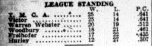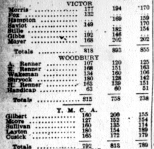 With the end of the first-half race in the Industrial bowling tournament only one week off, Victor went into a tie for first place by sweeping all three games from Woodbury while Freihofer’s spanked Y.M.C.A pacesetters twice. hurley company took three from Warren Webster in the other match .