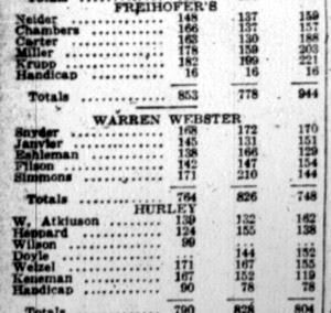Freihofer’s set a new league record by rolling 928 in the third game. Krupp’s total score was 602 pins, an average better than 200. His high mark was 221. Miller, a teammate, rolled 203. Moyer, of Victor, twice rolled 202, while Simmons turned in a 210 for Warren Webster.