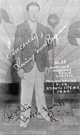 Walkathons and Dance Marathons became popular during the Depression years. Promoter W.E. Tebbets set up many of these events all over the country, bringing his own bands and entertainers along to the event. After a successful walkathon at Atlantic City in 1932, Tebbets arranged for a similar contest to be held in the Camden area early in 1933, using one of the hangars at Central Airport as his venue. The events were quite popular in their day. At least two other walkathons were held in Camden, one on October of 1933 and another in 1935. One of these events featured the "walkathon wedding" of Johnny Groves and Marie Broughton Besides Ira Coffey's Walkathonians, a band which featured at one time or another such players as trumpeter Edgar "Pudding Head" Battle, trombonist Clyde Bernhardt and drummer Red Saunders, the Camden walkathons are best remembered for the appearances of comedian Red Skelton, who went on to great fame and fortune on radio and in movies and especially television. Others of note who emceed the events included "Dud" Nelson and Dick Lord" Buckley. Besides local talent, there were a few "professional" contestants, who went on tour, sponsored by local businessmen back home, in a similar fashion to the professional golfers of today. One such "pro" was Eddie Nichols. Nichols was a fine vocalist as well, and was known as the "Man With A Million Songs" for his ability to cover just about any request sent his way. He sang with Cecil Mackey's band in Montgomery Alabama in the summer of 1934 before going out on the road with the Walkathon. He left the tour after meeting, falling in love with, and marrying a girl from Camden, New Jersey, Beatrice Boody. The Nichols settled down in Camden, Eddie finding work with Mother's Koffee House on Broadway. They later lived in Westfield Acres in East Camden, where there friend from the walkathon days, Red Skelton, would come to visit when in town. Thanks to Linda Nichols Fernandez for making images from her father's scrapbook available for this web-page in the spring of 2007, to Jenny Wills for sending pictures in the summer of 2007, and to Dell Moore, for identification assistance in 2009. |