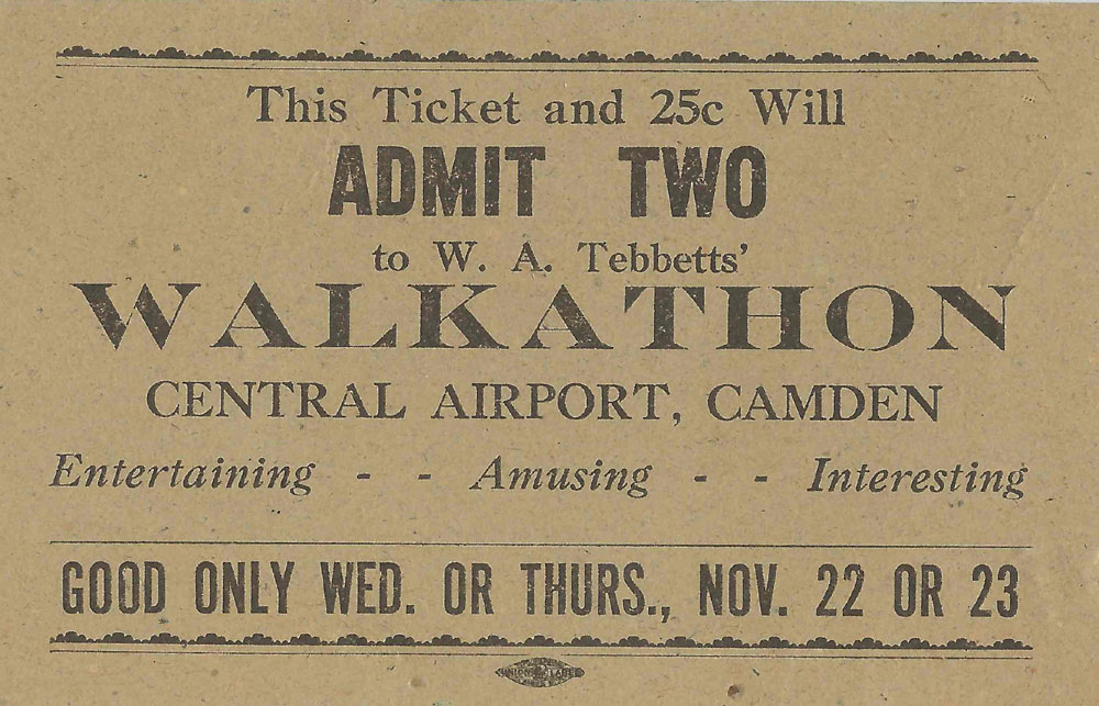 ENTER 'WALKATHON' Applications are pouring in daily from South Jersey youths and young women who wish to enter the "walkathon," a unique marathon endurance contest which will be launched us at the Central Airport 9 p. m. next Tuesday. More than 150 applications have been received to date, and prospective contestants may continue to submit applications until the medical examinations are concluded tomorrow or Saturday. One of the features of the forthcoming event will be that the personnel of the contest will be strictly local; no contestants have followed the promoters from similar walkathons in other sections of the country. The promoter will, however, have his own staff of entertainers. Among the latter are Coffee's Orchestra, a group of expert sepia players, who arrived here today for the start of the contest. W. E. Tebbetts, nationally known promoter, is presenting this novel form of athletic contest in the large hangar, which is now undergoing a transformation for the event. It is a scene of great activity; workmen are installing a huge ring for the contestants, while arrangements are being made to comfortably seat the anticipated capacity crowds in such a manner that they will be able to view with ease the unique contests from all points in the large building. Other equipment, including quarters for the contestants and a treadmill for the "grinds," is also being completed. Although the center of attraction will be the contestants themselves, and the spectators will undoubtedly become partisan and "root" for their favorites, Tebbetts has brought here a large staff of capable entertainers. Advertising programs will be presented continuously throughout the 24 hours every day. Five masters of ceremonies, headed by the well-known "Dud" Nelson, are retained so that there will not be one dull moment. One of the most expert clowns, "Red" Skelton, favorite of walkathon fans in many sections of the country, has formulated a new routine of hilarious performances. |