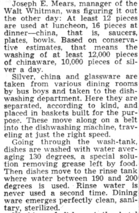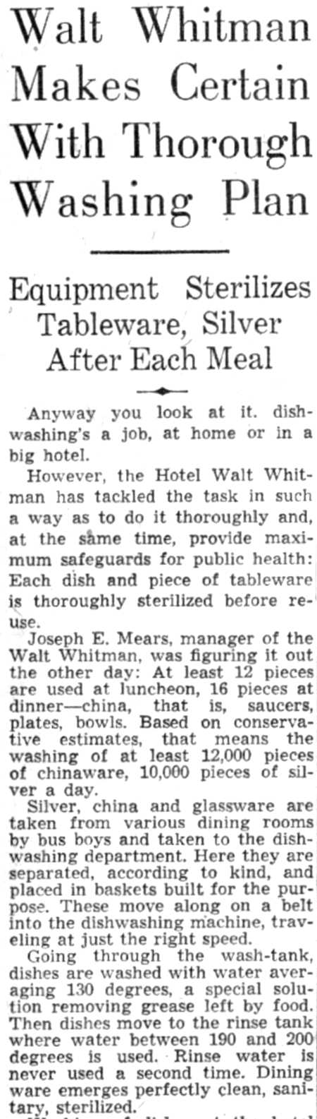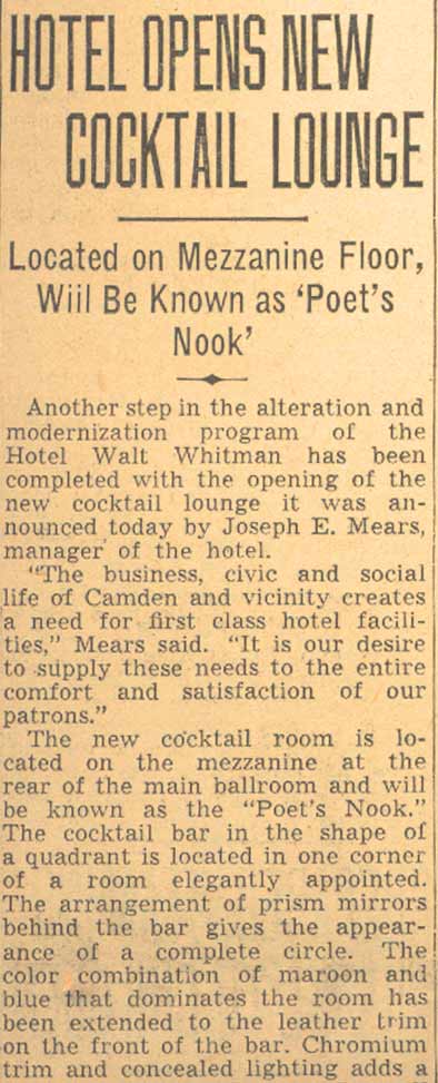 MEARS FLIES TO ATTEND HOTEL MEN'S PARLEYS Joseph E. Mears, manager of the Hotel Walt Whitman, flew to Cleveland yesterday to attend a meeting of the executives of the American Hotels Corp., with which the Camden hostelry is affiliated. Before he left, Mears said the Walt Whitman had known one of the really prosperous years in its history in, 1937. "Persons tell me there is a recession in business,'" declared Mears, "but you would never know it by the business in this hotel. We have had a swell year and I'm reporting this fact to our hotel chain. "No sir, there is no recession apparent around the Walt Whitman." |