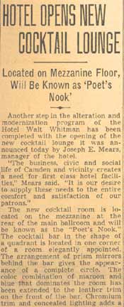 As the City of Camden began to fall on hard times in the 1950s, the Walt Whitman Hotel's maintenance began to suffer. In 1958, the Camden Chamber of Commerce, which had played a large part in the Walt Whitman's construction, and which had been headquartered there for so many years, held its annual gala at the new Cherry Hill Inn in neighboring Delaware Township. In the previous three years, landmark Camden businesses such as Hurley's department store, the Stanley Theater, the Towers Theater, and the Camden Courier-Post had either closed or moved to new homes in the suburbs. This trend would continue, and eventually the Walt Whitman Hotel itself was closed. Interestingly enough, one of the last owners of the Walt Whitman was Joseph N. Hettel Jr., whose father Joseph N. Hettel Sr., was an architect who designed many Camden banks, apartments, and commercial buildings. |