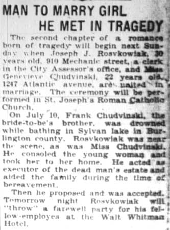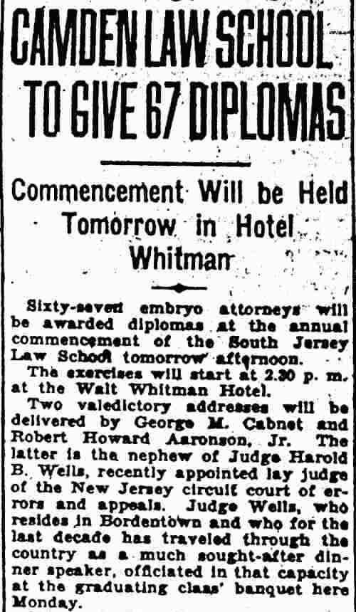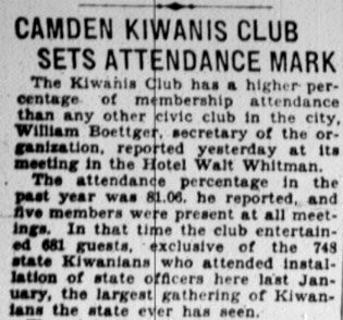 An exciting contest is expected in the annual election of officers of the Broadway Business Men’s Association. The elections, preceded by a banquet, will be held Wednesday evening, January 25, at Hotel Walt Whitman. Three merchants are candidates for the presidency, which will be vacated by Harry Pelouze. There are J.V. Moran, Walter Friant and Morris Futernick. They were nominated at the November meeting of the association. Another battle is looked for in the naming of a vice-president. M. Fuhrman and J.W. Holmes are the two candidates while Morris Jaffe is the retiring vice president. Edwin C. Norcross, president treasurer, will be unopposed for re-election. Albert S. Dudley will be unopposed when he succeeds David Tattersdill as secretary. Representatives from every business in every section of the city have been invited to attend the affair, while every one of the 150 members will probably be present. The principle speaker will be former Judge John B. Kates, of the Broadway Merchants Trust Company. An address on interstate traffic and its relations to the transportation problems of Camden business will be delivered by J.J. Ruster, head of the transportation department of the Camden -Chamber of Commerce. Francis B. Wallen and Loyal D. Odhner, president and secretary respectively of the Chamber of Commerce will also be guests of the merchants. A comparison of the work of other commercial organizations will be made by several well-known visitors. Benjamin Shindler, William Lipsitz and H. Zbieratski, presidents respectively of the East Camden, Kaighn Avenue and Mount Ephraim Business Men’s Associations, will speak. The new constitution and by-laws of the association will be adopted at the January meeting. Eighteen directors will be elected; six for terms of three years, six for two-year terms and a similar number for one year. The candidates for director are Harry Pelouze, Joseph Kobus , J.W. Holmes, Albert Israel, James V. Moran, Walter Friant, Dr. I.S. Siris, Joseph Fuhrman, William E. Cross, S. Abeson, M. Futernick, Howard B. Lee, Fred W. Schorpp, Morris Jaffe, W. Mitchell, L. Markowitz, Joseph Corbett, M. Lasala, P. Thatcher, W. Falture, G. Lockerman and David Tattersdill. |