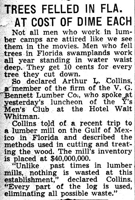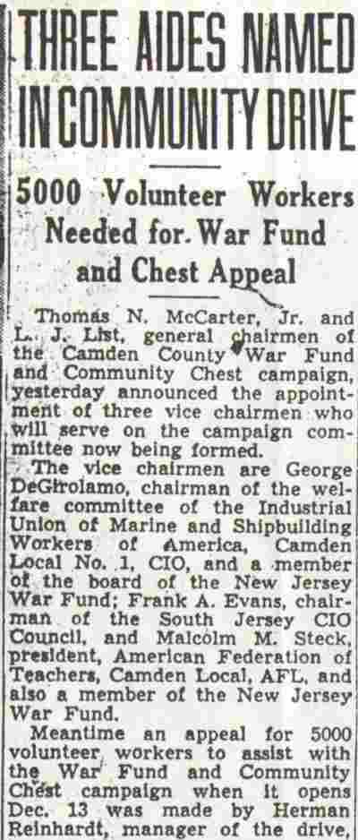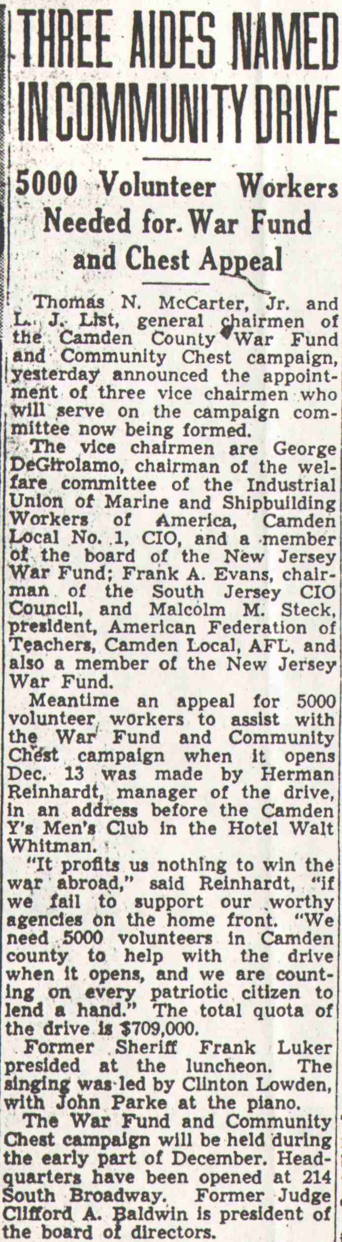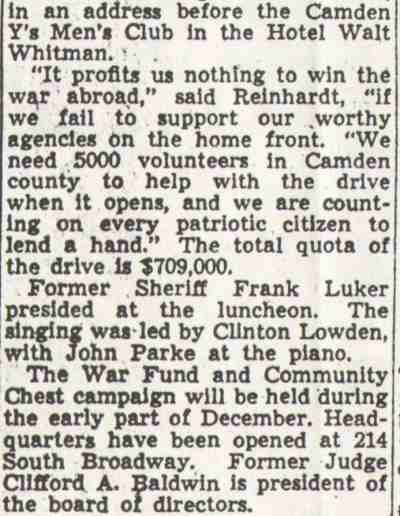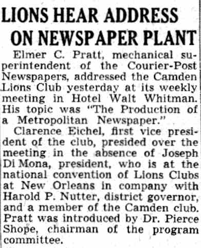 CLUB TOLD OF INDUSTRIAL DRIVE An industrial campaign for the purpose of inducing new business industries to locate in Camden will be part of the program of the Chamber of Commerce for this year, Loyal D. Odhner, secretary of the Chamber of Commerce, told members of the Rotary Club at a luncheon today in the Hotel Walt Whitman . Odhner’s outline of the chamber’s program, which included an industrial survey for the purpose of determining possibilities for new manufacturers and improving present business facilities, was approved by Francis B. Wallen, new president of the Chamber of Commerce, who attended the luncheon. “During these last five tears, Camden has had little or no industrial growth. Manufacturers have either chosen other localities in preference to us or else they have not even thought of us. I prefer to believe the latter is the case. Our first step, them is to make our city more appealing to the industrial prospect. This cam be accomplished by an industrial campaign with the cooperation of all business forces. “I am confident that before this years ends you will see the resources of this community mobilized into one of the greatest campaigns for new industries that has ever been waged in America. “In conducting this campaign.” Said Odhner “we must not lose sight of the fact that port facilities will be a point of leading interest to the prospective manufacturer. The patronage which our present pier is receiving is only a small indication of the value to our city of adequate port facilities. The port improvement program must proceed with all haste. Urged to Aid Movement Odhner urged members of the Rotary Club to get behind a movement to organize a force to meet the financial problems that will accompany the advent of new industries. “With our survey completed,” Odhner continued “our next step will be to determine the type of industries that can locate in Camden most profitably to themselves and to the community. “Another important step will be to interest the people of our own city so They will report to us any new firms contemplating a change of location. Most cities which have conducted effective industrial expansion have secured their best leads from their own people. Still another step is well advised selective advertising, confined to those mediums which actually receive the attention of business executives.” Odhner said that as a preliminary step in the campaign it is the intention of President Wallen to ask all of Camden’s neighboring towns to join with her in this movement. “Sometime in March,” he said, “it is hoped a meeting of all leaders of surrounding communities will be held for the purpose of forming a Greater Camden Chamber of Commerce. |