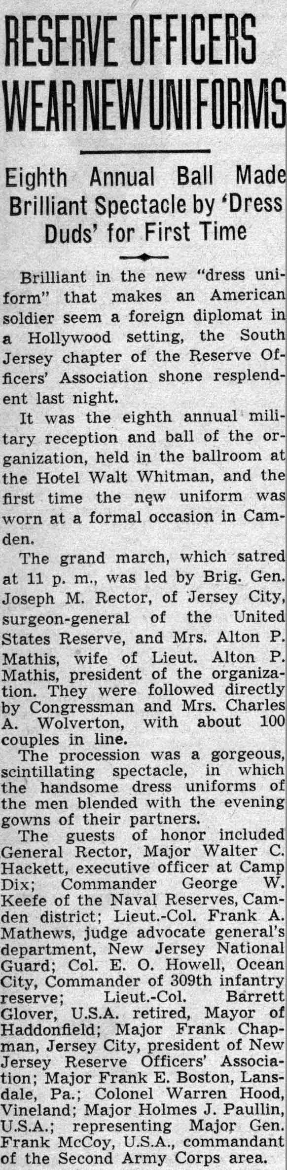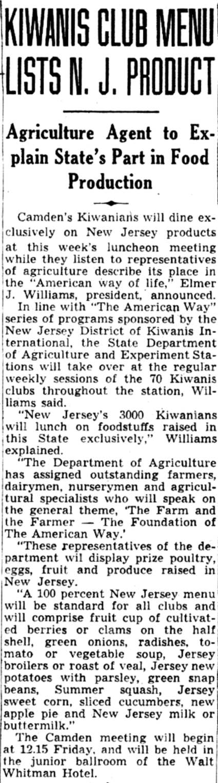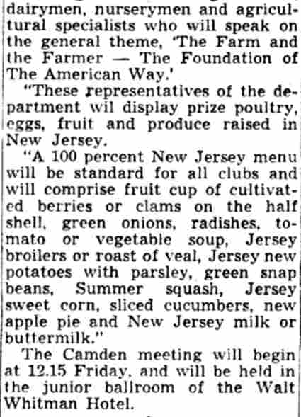 BROADWAY MERCHANTS TO DINE TOMORROW The third annual banquet and election of officers of the Broadway Business Men’s Association will be held tomorrow evening in the Hotel Walt Whitman . Three candidates seek the presidency of the organization, Morris Futernick and Walter Friant, merchants, and James V. Moran, general manager of the Hurley Store. Rev. Camille Estornelle, rector of St. Johns Episcopal Church, will deliver the invocation, while Harry Pelouze , president of the association, will be toastmaster. john b. kates , president of the Broadway Merchants Trust Company , will be the principal speaker. Five minute talks will be delivered by William Lipschitz, president of the Kaighn Avenue Business Men’s Association; Benjamin Shindle, president of the East End Business Men’s Association; Harry H. Whaland, vice president of the Mount Ephraim Business Men’s Association; Francis B. Wallen , president of the Chamber of Commerce; Lloyd D. Odhner, secretary of the chamber and J. J. Raster, transportation manager of the chamber. |