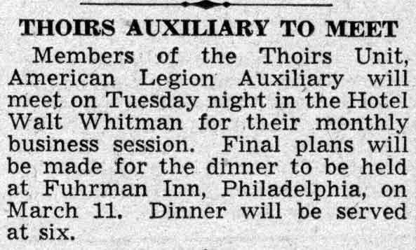 Party Tables will be placed for bridge, five-hundred and pinochle at the card party which Corporal Raymond C. Thoirs Post of the American Legion will give in the ballroom of the Hotel Walt Whitman on Friday evening. Playing will begin at half after eight o’clock. Walter Garland, chairman of the card party committee, has announced. The card party is one of the post’s main events of the year. The auxiliary is co-operating and it is expected that several hundred persons will attend.