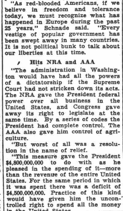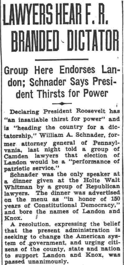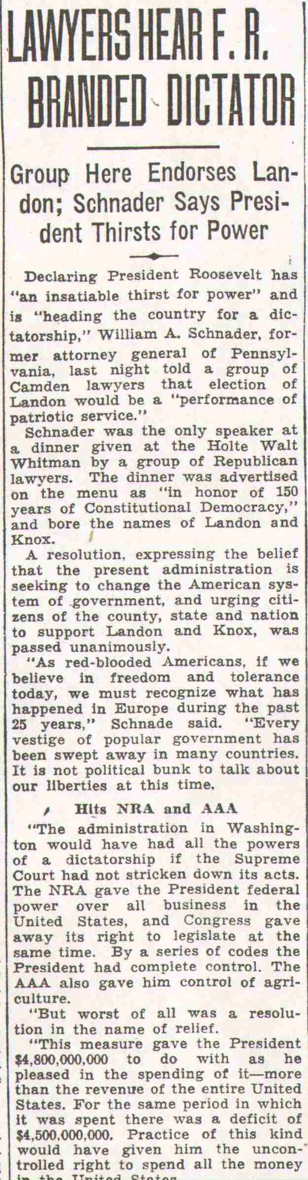 CLUB HEARS HITLER DENOUNCED Adolph Hitler and his "brown barbarians" were accused of aiming to make war the "be-all and end-all of human evolution" in an address by Walter Schoenstedt, native-born German, world traveler and author, before the Camden Rotary Club in Hotel Walt Whitman, Introduced by Leon H. Rose, Camden lawyer, Schoenstedt told the club members at their weekly luncheon he would not speak against Germany, but would "point out the evils of a dictatorship under Hitler, who is not Germany." After the meeting, Schoenstedt explained he came to this country a year ago to aid in preserving 'Ger-man culture and to warn this nation against Hitler, whom he described as a "destroyer of the ideals of great philosophers and teachers." Since coming to the United States, he has aided in the organization of German-American Leagues for Culture, he said. There is such an organization in New York, another In Philadelphia, and he plans one in Camden. Goethe, Heine Banished "The aim of the great. German philosophers," said Schoenstedt, "was the happiness, of humanity, Today the foremost aim of the dictator is to make war the be-all and end-all of human evolution. Goethe and Heine have vanished from German school readers and the words of the new exponents of German culture have taken their place. "The fight of the German rulers against thought and reason, against literature and science is not an accident. This hatred which we find in every speech concerning literature is expressed in the work of one of the leaders in the official German world of letters: "'When I hear the word culture, I reach for my revolver: "In Germany they tell the young people there is no life witl10ut war. When young people in the grade schools or in high schools gather for their graduations, they see as they come into the auditorium huge posters on the walls bearing the slogan that is the spirit of German education today: "'We are born to die for Germany." |