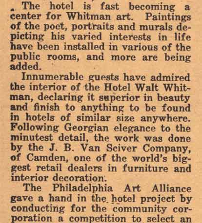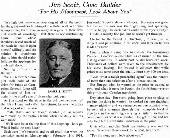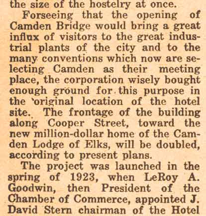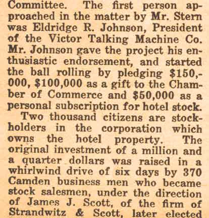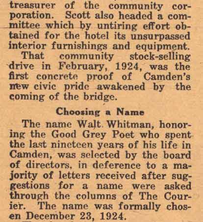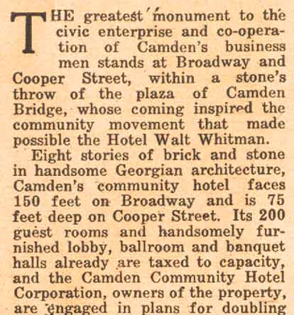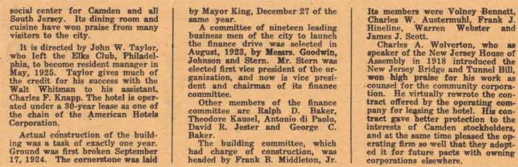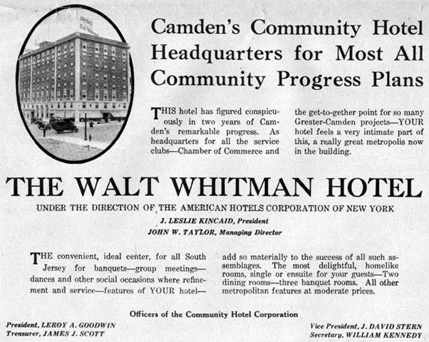 The WALT WHITMAN HOTEL was a project championed by the Greater Camden Movement, a group of business and civic leaders who had begun to come together shortly before and during World War I. They had been especially effective in raising funds county-wide to support America's war effort. After the war, the Greater Camden Movement's grand plan to stimulate economic recovery and optimism was the construction of a bridge between Camden and Philadelphia, and a community hotel on the Camden side of the bridge, along with the building of a road network leading away from the bridge south-east through Camden County towards the Atlantic Ocean. In 1920 Eldridge Johnson, the President of the Victor Talking Machine Company of Camden, pledged $100,000 towards the construction of the proposed hotel in order to house the newly formed Chamber of Commerce. In 1923 the Camden Chamber of Commerce, led by LeRoy A. Goodwin, appointed J. David Stern, the owner of the Camden Courier, chairman of the Hotel Committee. In 1924 the Community Hotel Corporation was incorporated. In six days, $1,250,000 was raised by a committee of 370 Camden businessmen, led by James J. Scott, partner in the Strandwitz & Scott sheet metal works, in February of 1924. Scott would become treasurer of the new Community Hotel Corporation, and would procure many of the hotel's furnishings. Other members of the fundraising and building committees included Scott's partner William Strandwitz, W. Leonard Hurley (hurley's department store), George A. Munger (Munger & Long Department Store), lumber merchant Volney G. Bennett, Frank Hineline (Camden Lime Company), heating manufacturer Warren Webster, and insurance and real estate agents david baird jr., Leon Todd, Ralph D. Baker, and Charles W. Austermuhl. Congressman Charles A. Wolverton played a role as well. Both Munger and Austermuhl's partners, Elmer Ellsworth Long and Andrew B.F. Smith, were also heavily involved in the Greater Camden Movement. The Camden Chamber of Commerce released an extensive account of the building of the Walt Whitman Hotel in the September 1925 edition of Camden First, the Chamber's official publication. |