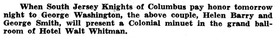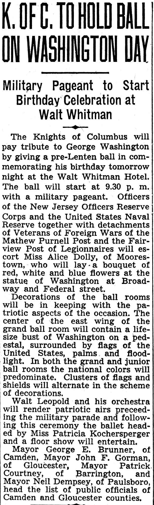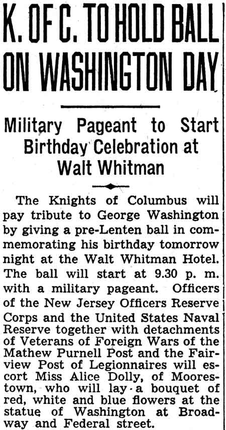 PRE-LENTEN BALL PLANNED BY K.OF C. One of the principal pre-Lenten events in this city will be the Knights of Columbus Ball which is to be held in the Hotel Walt Whitman on Tuesday evening, February 22. Since the ball falls on Washington's birthday the program has been centered around the observance of the national holiday. The Women's Committee has completed plans for its participation in the affair and has announced that many dinner parties are being arranged, preceding the ball. John A. Reynolds is general chairman of the ball committee. Mrs. Jere Crean heads the women's committee and is assisted by Miss Margaret Powell, Miss Madeline McFeeley, Miss Alice Dolly, Miss Margaret Moore, Miss Winifred Cogan, Miss Julia V. Kirk, Miss Kathryn Kelley, Miss Mary McGrath, Miss Teresa Regnery, Miss Margaret Kelley, Miss Jule M. Carey, Miss Winifred Stafford, Miss Rose Mary McKernan, Miss Marie B. Carr, Miss Rita Reigert, Miss Frances Jagod, Miss Mary Verga, Miss Anna Connell, Miss Monica Barrett, Mrs. Kirk B. Barb, Mrs. Marie Stanton Kelly, Mrs. Andrew McMahon, Mrs. Sabba Verdiglione, Mrs. John Reynolds, Mrs. Joseph Mears, Mrs. Charles Grimley, Mrs. John P. Daly,, Mrs. John Holt, Mrs. Frank Daly, Mrs. James A. Kane, Mrs. Joseph P. McShane and Mrs. Patrick A. O'Connor. |