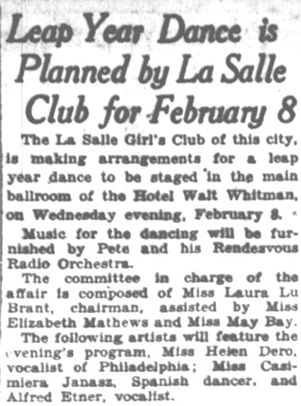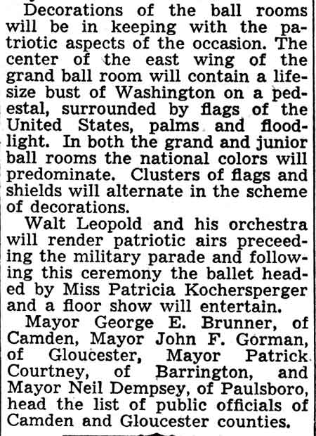 500 Five hundred persons attended the second annual ball of Camden Forest, No. 5, Tall Cedars of Lebanon, Saturday night in Hotel Walt Whitman. Featured was a vaudeville floor show. The ballroom was festooned with green and white, colors of the Tall Cedars. A sign in the same colors back of the stage read "Welcome Camden Forest, No. 5." Music was furnished by Sonny James and a 16-piece orchestra. The general ball committee included the following sub-committee members: Joseph C. Brown, grand tall cedar; William E. Strouse, chairman, and Daniel W. Forsyth, secretary and treasurer; grand conductor, Walter W. Griffins; reception, Paul C. Ireton, leader; George Murray, Walter Morris, William Roher, Harry Holt, Victor Marx, Charles Ackley, Howard Dahl, Francis Gaskill, Frederick von Nieda, and Frank Hartmann, city commissioners; tickets, Walter Mattison; door, Louis Bull and Paul B. Miles; press representative, Frank H. Ryan; wardrobe, Charles Neil, William Strong, Elmer Burgess, Taylor Kellogg and Charles Green; electrical, Wilbur Peters; public safety, Lieut. George W. Frost, Frank Jaggard, russell young and Francis Guthermann; decorations, Fred Knodel, Charles Dorrmann, Harry Sykes, Harry Flowers, Merton McCormick, Edward Zimmerman and William Del Baugh.. |