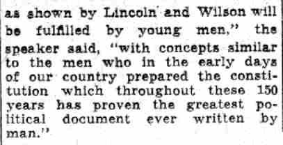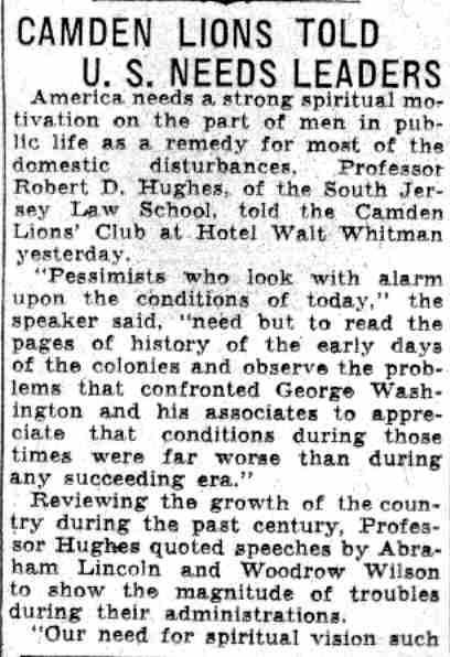 GROUPS MEET TO REVERE LINCOLN Schoolchildren, members of service clubs, and civic leaders joined the Camden County Real Estate Board yesterday in paying tribute to the memory of Abraham Lincoln at a luncheon in the hotel walt whitman. Among the guests present were Dr. Leon N. Neulen, city superintendent of schools; Albert M. Bean, county superintendent of schools; and Joseph Hale, president of the Camden Lions Club. The principal speaker was Hamilton R. Disston, who conducts public forums at the Penn Athletic Club in Philadelphia, and is a teacher of public speaking. Introduced by J. Frank Hanly, president of the Real Estate Board, which was host to the other organizations, Disston gave a recitation in which he traced the career of the Great Emancipator from his lowly beginning until his death by assassination in Ford's Theatre, Washington, April 15, 1865. Selecting as his topic: "Lincoln the Man," Disston described the anguish and disappointments through which the war-time President lived. He recalled the incident prior to Lincoln's election as President for a second term, when he was requested to write a letter of condolence to a woman who had lost five sons in the Civil War. "Lincoln," said Disston, "was not a man who could be exploited for political purposes. "He received the request to write the letter to Mrs. Lydia Bixby, of Boston, prior to his election, but he waited until after the campaign was over before he sent condolences to that bereaved mother. That was one of his marks of greatness." Disston recited Lincoln's Gettysburg address, characterizing it as one of the world's literary gems, and then took his audience back to the sorrowful day on April 15, 1865 when the President had the dream of premonition of his own death—the vision wherein he saw himself aboard a "dark, formless boat," that sailed away into darkness. Disston concluded with a dramatic .picture of the President's assassination in Ford's Theatre and the escape of the killer, Booth. Disston was obtained as speaker through Ernest E. Lindner. Represented among the realtors at the luncheon were three generations in the family of William J. Flemming, long a member of the board. Present with Flemming were his son, William F. Flemming, also a board member, and the latter's small son, William W. Flemming. Eighty-five persons were present at the meeting. |