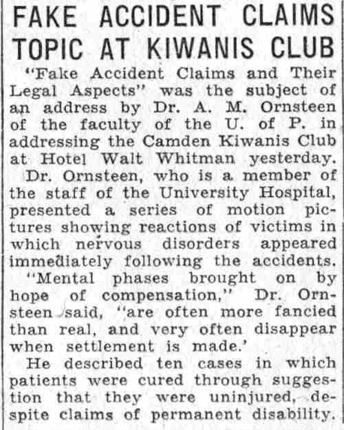 DISCOUNTS FUMIGATION VALUE Fumigation as a method of preventing disease was discounted by Dr. Arthur L. Stone, city health director, in talk yesterday before the Y’s men’s Club at the Hotel Walt Whitman. “It gives a false sense of security,” he declared. “It kills only the germs upon the surface. As a matter of fact diseases are carried by individuals, and spread by contact of persons. “Modern public health does not depend upon safeguard of the environment, but upon safeguard of the individual. It does little good to choose methods for fumigation, when the dis-ease may be spread by some individual who carries the bacteria.” Dr. Stone took as his subject “Secrets of Health.” He pointed vaccination as the only certain way to immunize persons against disease. Smallpox and typhoid fever now are controlled by antitoxins, and diphtheria is well on the way to control. He said that a serum for scarlet fever soon may be discovered. As a result of his vaccination activities here Dr. Stone predicted that the city will soon have “army of immune children.” More than 10,000 children have been vaccinated against diphtheria, and there will be more as soon as parents learn to lose their fear of the treatment, he said. Prevention of infantile disease has cut the country’s death rate more than any other source, he declared. Much of the decrease can be ascribed to pre-natal educational work among mothers. He asserted that playgrounds play an important part in brain development as well as muscular development. Brain development parallels development of the muscular tissues and a sound body is necessary for sound thinking, be stated, reverting to an old maxim. Although 80 percent of children are born healthy by the time they reach their majority, 10 percent of them are defective in some way, according to the health officer. Inability of humans to take care of themselves was given as the reason. Prior to Dr. Stone's talk, the club distributed prizes won in a recent bowling tournament. First prize went to Jim Burroughs; second prize, to Winfield S. Wilson; third, Horace Sherman, and fourth, Robert McCay. It was announced that the club’s bowling team will compete with the Woodbury Kiwanis Club team in that city tonight. On January 3rd the Y’s Men’s team will bowl the Woodbury Y’s Men’s Club team. |