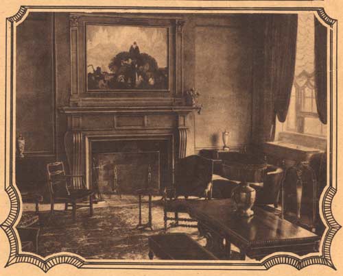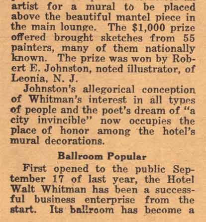 One end of the main lounge of the Walt Whitman Hotel, showing mural of the great poet |