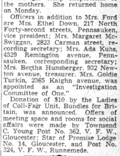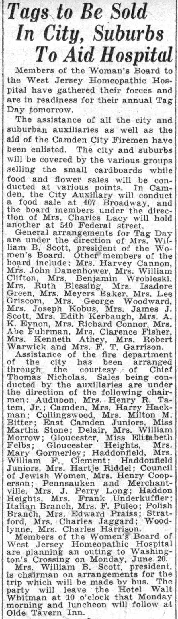 out-patients diabetic clinic. Dr. Anderson covers the entire state of Pennsylvania. She is the psychiatrist in charge of the women's division in the Pittsburgh City Hospital and the Allegheny County Hospital. She is assistant professor of nursing at Duquesne University and a special lecturer on mental hygiene in the department of nursing education at the University of Pennsylvania. "Emotional Hygiene, the Art of Understanding" is the title of a book which was written by Dr. Anderson during the past year and which recently has been published. Mrs. Orris W. Saunders, of this city, is hospitality chairman for the day. Mrs. Arthur J. Casselman, of this city, and Mrs. E. Reed Hirst, of Haddonfleld, will pour and those assisting will be Mrs. William Braun, Mrs. Penrose Thompson, Mrs. A. Lincoln Sherk, of Merchantville; Mrs. Kenneth B. MacAlpine, of Gloucester; Mrs. Kenneth Athey and Mrs. Alfred M. Elwell, of this city. The Auxiliary has planned a fashion show to be followed by cards for Monday evening, March 7, in the Hotel Walt Whitman. Mrs. H. Wesley Jack, of Haddonfield, is general chairman for the affair. Mrs. Oswald R. Carlander, of Merchantville, is president of the Auxiliary. |