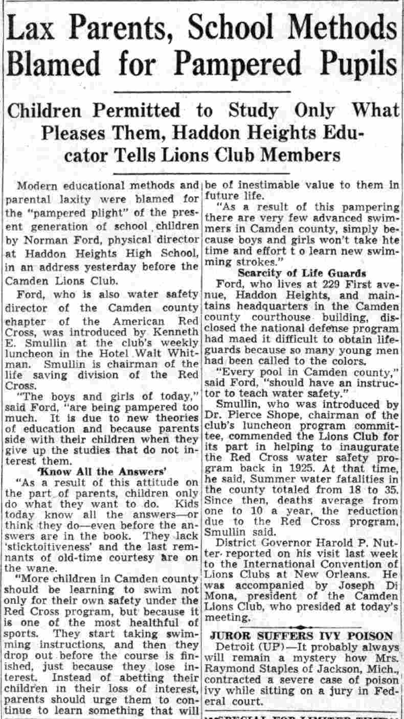 IS LAUDED IN AID TO CRIPPLES Camden county educators in providing special training for crippled children, leads the state in the movement to rehabilitate youths suffering from physical defects. That opinion was expressed by Joseph G. Buch, of Trenton, chairman of the New Jersey State Crippled Children's Commission, speaking before the Camden Kiwanis Club at Hotel Walt Whitman yesterday. "Through the efforts of the state organization and the Elks Crippled Kiddies committee," Buch said, "every crippled child in New Jersey is now offered the chance for medical attention, training and vocational guidance. I ' "More than 13,000 children between the ages of one and 18 years are registered with the state organization at Trenton, and 364 of those able to attend some special training class are being rehabilitated." Buch urged the service clubs to aid the organization in placing youths in positions in the working world. A delegation of Kiwanianians from Brooklyn attended the meeting, headed by the club president, John Kay. The visitors were welcomed by former Judge John B. Kates. Dr. Martin H. Collier, president of the Camden club, made a report on the annual state convention of Kiwanis held at the hotel last week. During the meeting musical entertainment was provided by Gene Stroud, singing banjoist and Harry M. Taylor, pianist. |