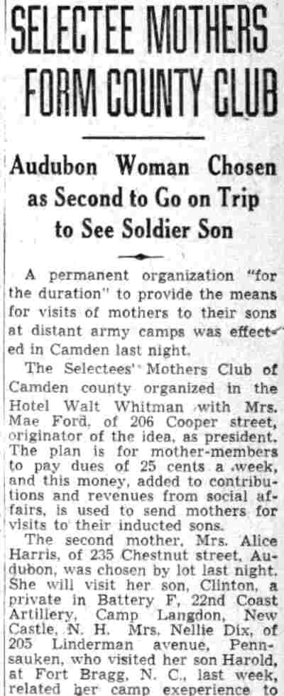 Federation Leaders To Address Professional Women State and National officials of the Federation of Business and professional women will address the Camden branch at its January meeting in the Hotel Walt Whitman on Thursday evening. Miss Virginia Montgomery, National Federation program chairman and Miss Mary L. Johnston, New Jersey federation president, are slated to make the principal addresses following dinner. Dr. Lettie Ward, president of the Camden branch will preside. |