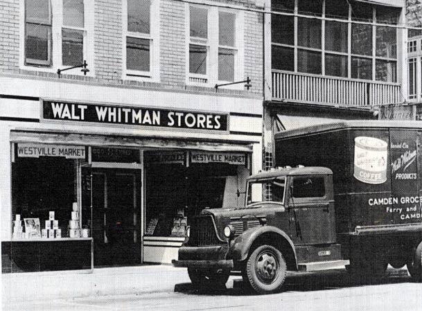 As early as the 1930s the Walt Whitman Stores could be found throughout Camden and the surrounding towns. While the chain may have been long gone by the early 1980s, one or two buildings in Camden still sported the green Walt Whitman Stores sign. The Walt Whitman Stores operated under the sponsorship of the Camden Grocers Exchange, a food distribution business which by the 1940s had a warehouse on Atlantic Avenue, west of Ferry Avenue.