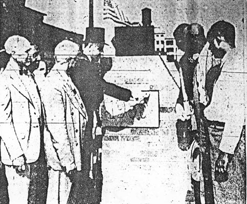 CORNERSTONE OF THE NEW South Camden Branch YMCA was cemented in place Sunday at Sixth and Liberty streets by Edward T. Bowser, of Newark, most worshipful grand master of the Prince Hall affiliation of the New Jersey District Grand Lodge F&AM. Watching Bowser at the ceremony, left to right, are Charles H. Wagner, president of the Camden YMCA; Albert K. Flournoy, executive secretary of the branch; William P. Partenheimer, general secretary of the Camden YMCA; an unidentified member of a team from the grand lodge, who assisted Bowser; Dr. J.C. Jones, a member of the branch's committee of management and W. Arthur Jones, chairman of the membership committee.