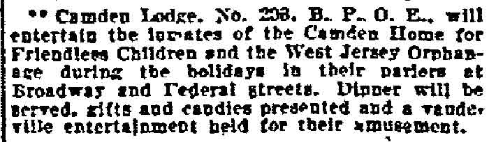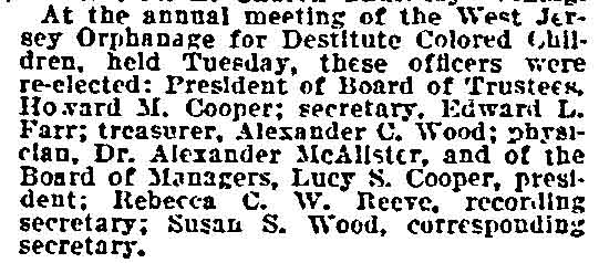 In the 1890s founder John Cooper's son, prominent Camden lawyer Howard M. Cooper, was President of the West Jersey Orphanage. His wife Lucy Cooper was president of the Board of Managers. Dr. Presley also sat on this Board in 1894.