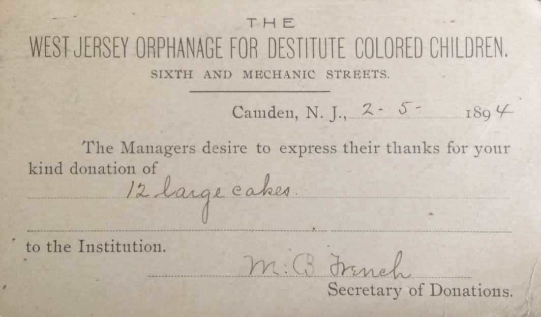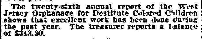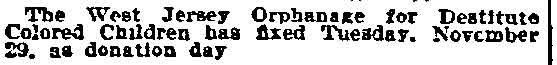The West Jersey Orphanage was chartered February 17, 1874. The home was organized by the Society of Friends and its object was to provide a home for destitute colored children. Founders included Camden businessman John Cooper and his wife Mary. Joseph M. Kaighn donated three lots of ground at Oak and Chestnut Streets, and the three adjoining lots were purchased. Subsequently, however, it was decided to purchase of James W. Purnell the two story brick building, erected by Joseph Kaighn for a farmhouse, at 6th and Mechanic Streets, together with one-half acre of land adjoining. The building was opened for the reception of colored children January 20, 1875 .