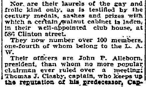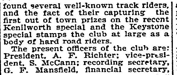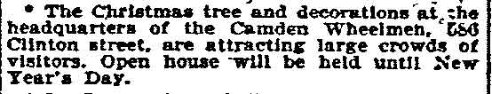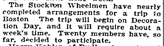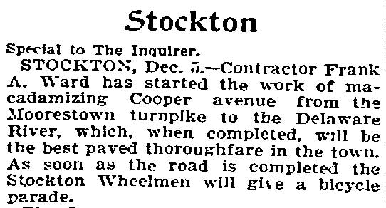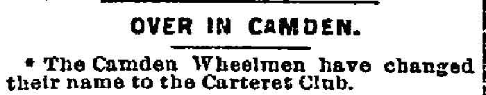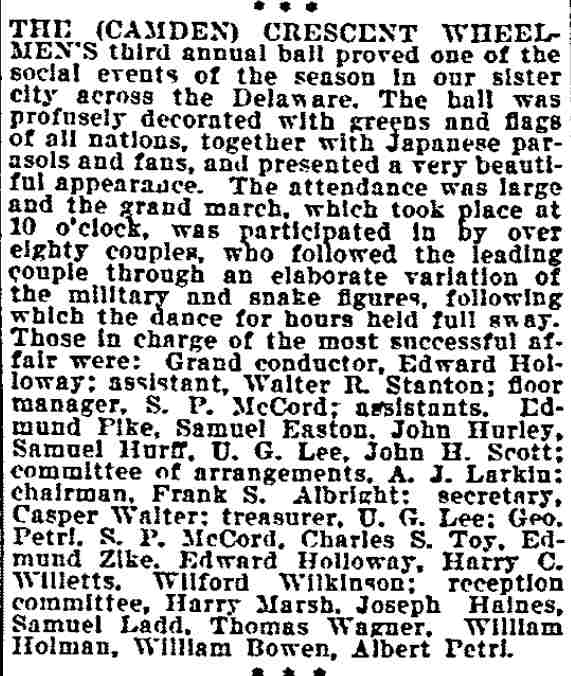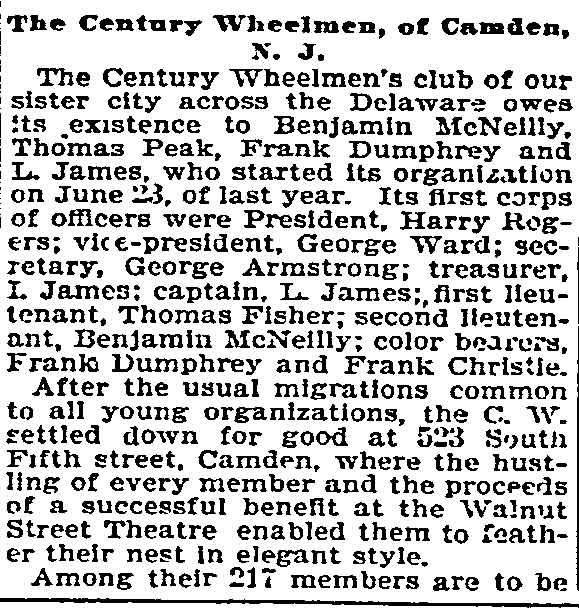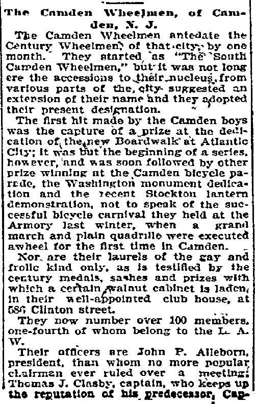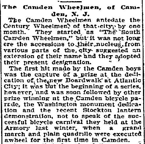 The development of the bicycle spawned mucn enthusiasm in the 1890s. Bicyclists, or as they were called in those times, Wheelmen, formed clubs, a national association, held races, conventions, and all matter of social events. Three clubs were of note in Camden, the Camden Wheelmen, the century Wheelmen, and the Stockton Wheelmen, who hailed from what was then the Town of Stockton, which became part of Camden in 1899. Phil Cohen |