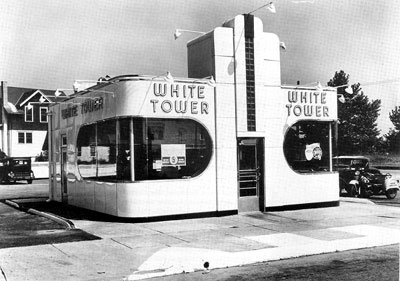 For the better part of 50 years, the first thing any one saw of Camden when coming over the Ben Franklin Bridge was the White Tower hamburger stand that stood on Broadway at the Bridge Plaza. Likewise those traveling west on the Admiral Wilson Boulevard would pass Marbett's restaurant as soon as they passed Baird Boulevard, two more White Towers were at the city's "eastern gates", one at Federal Street and Crescent Boulevard (Route 130), the other at Haddon Avenue and Crescent Boulevard. Another White Tower was located on Crescent Boulevard at Route 130, just outside the city limits. The success of the White Castle chain, established in Wichita, Kansas, in 1921, prompted immediate imitation. The White Tower restaurant chain was launched in Milwaukee in 1926. Like White Castle, the firm adopted a small, white, castle-like building. The design was intended to symbolize stability, strength, and permanence, while the white exterior symbolized purity and cleanliness. The early buildings designed by the White Tower chain kept surface ornamentation to a minimum and used a tower and pseudo-buttresses along the sides of each building to suggest the medieval castle. Later porcelain-enameled buildings were bold and fully streamlined, a sharp contrast to the aging buildings located adjacent to the restaurant, especially when lit at night. Like the White Castle designs, the White Tower buildings functioned as billboards; they were readily identifiable and symbolized their distinctive food. The interior of the White Tower restaurant was polished chrome and white tile. The menu included hamburgers, coffee, ham sandwiches, pie, donuts, and soda. From Milwaukee, the successful White Tower chain spread to Chicago, Cleveland, Detroit, Philadelphia, Pittsburgh, New York, and Boston, among other cities. The chain survived the depression by offering inexpensive food-burgers sold for a nickel, the simplicity of design, and the medieval fantasy that offered a brief escape. By the mid-1950s, the chain had grown to 230 stores. During the late 1950s and 1960s, the chain experimented with the Tower-O-Matic concept. The idea of a fully automated eatery was unsuccessful and the chain continued with the traditional fast food service. Marbett's was a part of the White Tower chain, and was their attempt at a larger sit-down restaurant. The Marbett's in Camden was originally a White Tower building, and was converted into a Marbett's. When this was done a second White Tower was built on the opposite side of Admiral Wilson Boulevard. This building was hit by a truck in the early 1960s. Dorothy Kopakowski, an employee, was seriously injured. The building was later razed and a gas station was built on the site. White Tower survived in the Camden area until at least 1981, when the restaurant on Route 130 and Haddon Avenue was sold. |